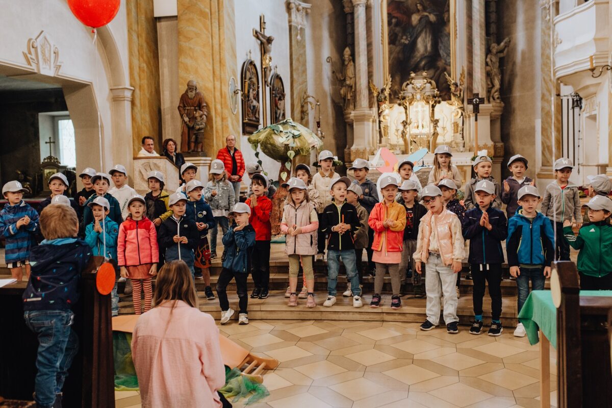 Mit einem lebendigen Mix aus Gebet, Musik, Symbolik und szenischem Spiel wurde deutlich, dass dieser Schritt in die Schule ein mutiger und freudiger Aufbruch ist. In einer von den Vorschulkindern mitgestalteten Spielszene riefen diese mit strahlenden Gesichtern: „Wir sind bereit!“ und flogen symbolisch aus ihrem Nest durch die Kirche. Begleitet wurden sie von den ermutigenden Worten: „Du bist nicht allein. Du kannst fliegen. Vertraue dir und hab keine Angst vor dem Himmel.“ Anschließend erhielt jedes zukünftige Schulkind einzeln den persönlichen Segen durch Herrn Dekan Hösl. Ein besonderer und stiller Moment für jedes einzelne Kind. Danach ging es weiter zur jeweiligen Gruppenleitung, die dem Kind ein Cappy mit dem Anfangsbuchstaben seines Namens aufsetzte. Dieses sichtbare Zeichen der Wertschätzung war ein liebevoller und symbolträchtiger Abschluss, der die Kinder bestärken und ermutigen sollte, ganz im Sinne des Themas „Verlass dein Nest und fliege“.