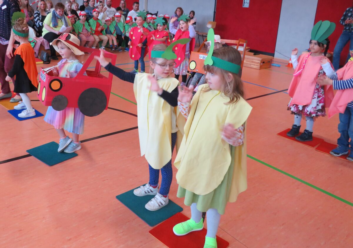 Die Wettermänner (Minis) sangen von Regen, Schnee und Wind. Den Flug der Bienen symbolisierten die beiden Krippengruppen. Die wichtige Arbeit der Landwirte zum Wohl der Natur und Umwelt spielten die Midis beim Treckersong. Bei der Aufführung der Midis stand die Plastikflut und deren Verminderung beim Einkaufen und im allgemeinen gesellschaftlichen Leben im Mittelpunkt.