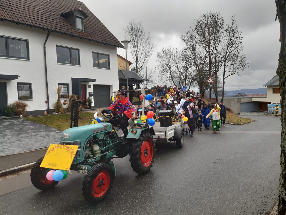 Mit „Kinderhaus Helau“ und „Tschingdarassa Bumm“ sind die Kleinen des Kinderhauses St. Pankratius Parkstein zum Start in die Faschingsferien am Freitagmittag mit ihren Eltern zum Rathaus gezogen. Begleitet haben den Faschingszug zwei Bulldogs und ein Auto, in dem der Kinderprinz und die Kinderprinzessinnen Julia, Noah und Ida chauffiert wurden.