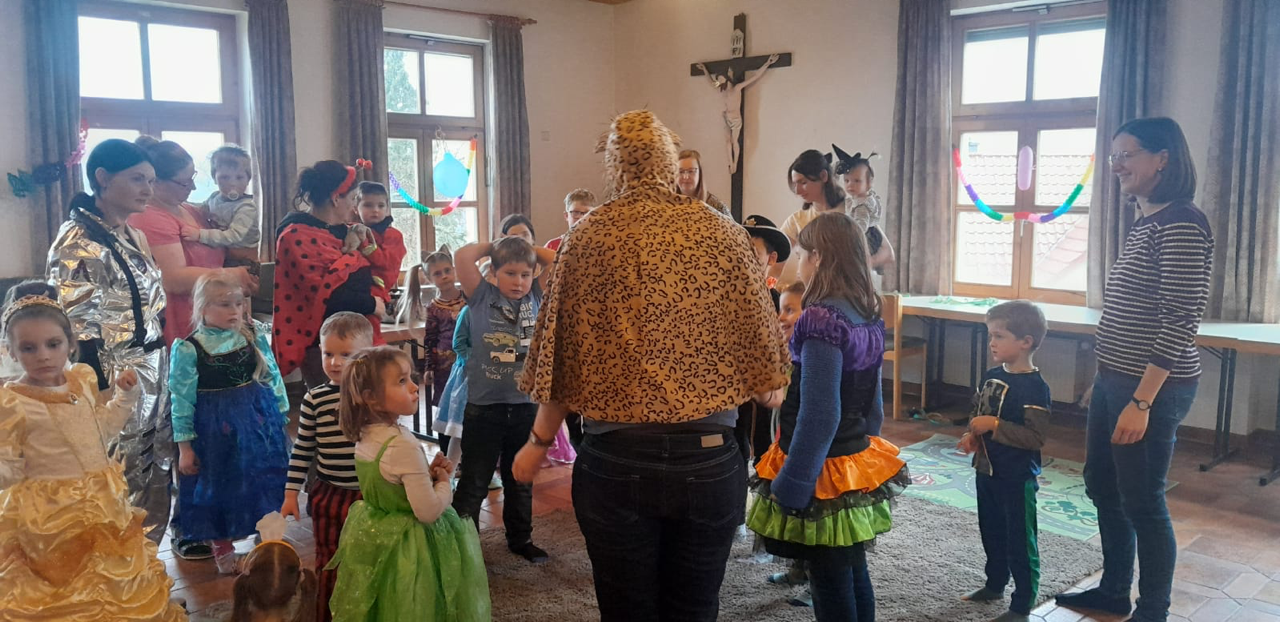 Fotos aus dem Pfarrheim zeigen fröhliche Kinder, die mit dem Pfarrer sangen, tanzten und beteten. Auch Erwachsene schunkelten mit ihren Kindern zur Faschingsmusik. Gleichzeitig blickt die Gruppe auf den Herbst, wenn das Angebot wieder starten soll und ein neues Quartier bereitstehen muss.