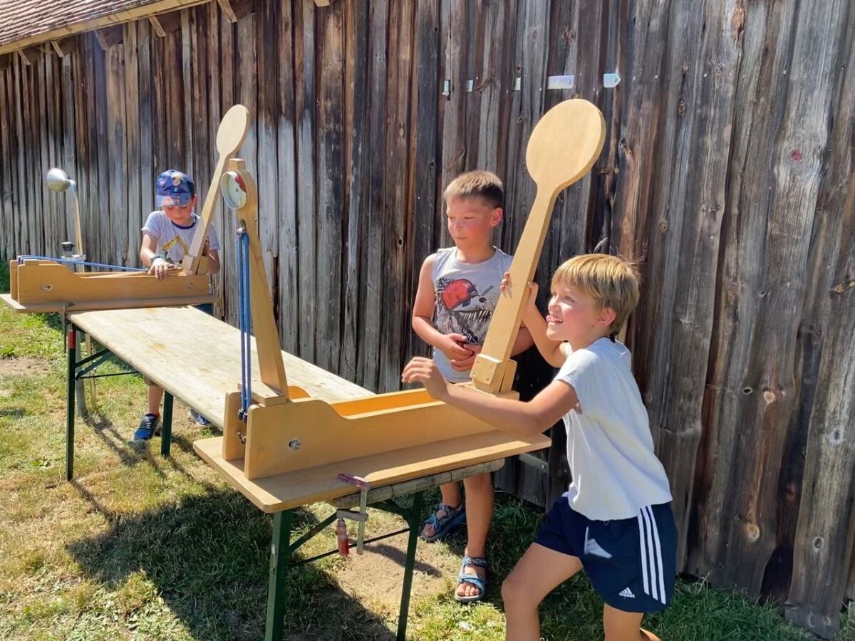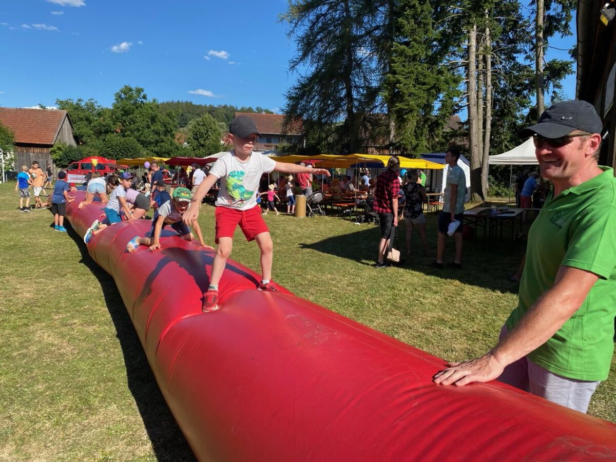 Gleich danach stürmten die Kinder schon wieder zurück auf die Spielplatzgeräte, zu den Süßigkeiten-Wurfmaschinen und vor allem auf die mit Luft gefüllte Hüpfschlange, die seit vielen Jahren fest zum Siedlerfest gehört. Auch ein Strohballenberg war wieder aufgebaut, auf den die Kinder mit Freude kletterten und dann oben die tolle Aussicht genossen.