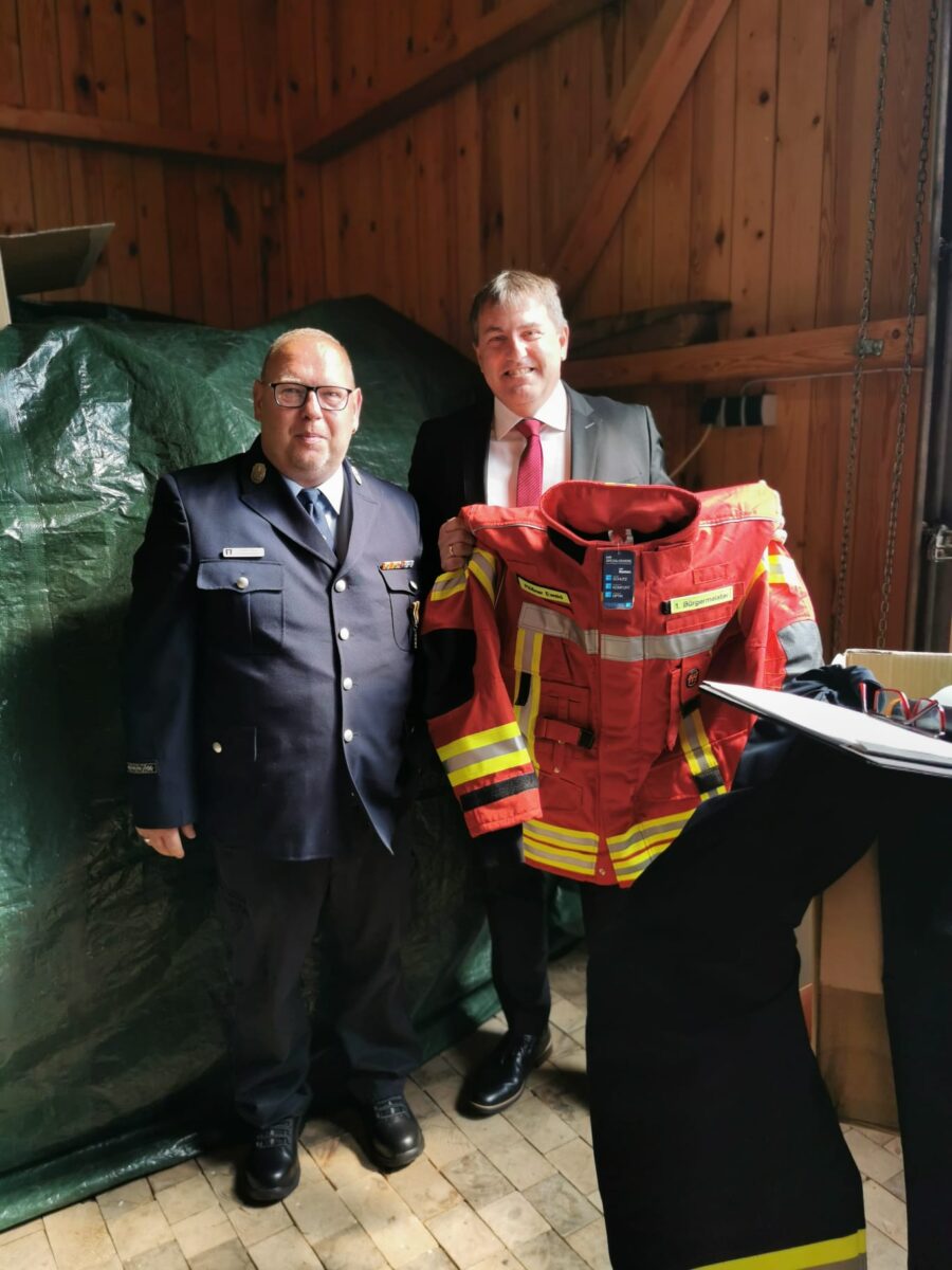 Als besonderes Zeichen der Anerkennung und Wertschätzung übergab Torsten Goss im Namen aller Gemeindefeuerwehren an Bürgermeister Ewald Plössner einen Schutzanzug für Notfalleinsätze. Dieser Schutzanzug ermöglicht es dem Bürgermeister, sich ein Bild von den Einsätzen zu machen und gleichzeitig sicher geschützt zu sein.