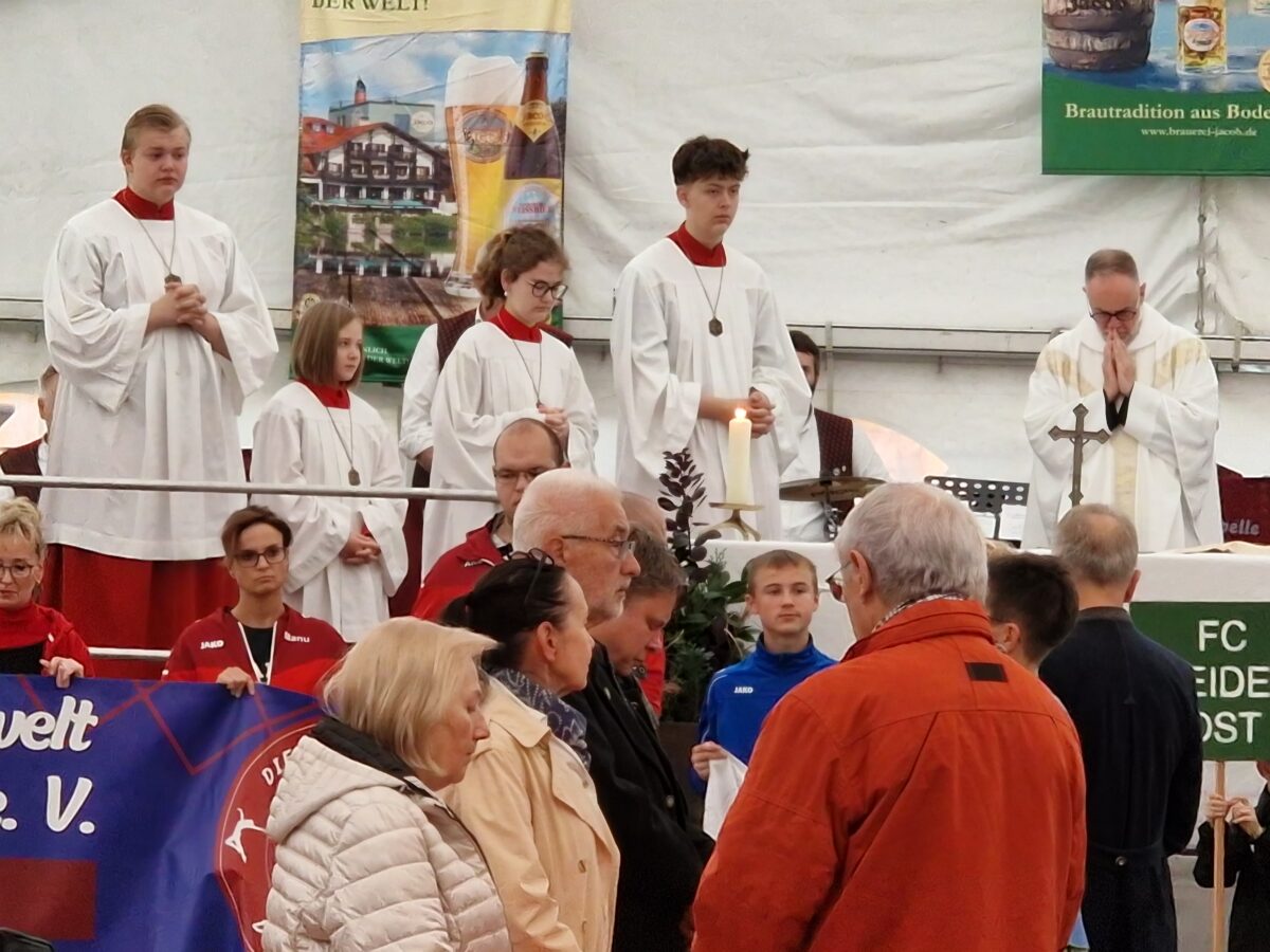 Im Festzelt feierte Geistlicher Beirat Pfarrer Wolfgang Weyer von St. Josef den Gottesdienst. In seiner Predigt stellte er den Zusammenhalt in den Mittelpunkt: „Lasst das Fest gelingen und seid Brüder und Schwestern im Herrn. Ihr seid lebendige Steine, die sich in Nächstenliebe verbinden.“ Beim „Te Deum“ und dem Bayernlied sang das ganze Zelt mit.