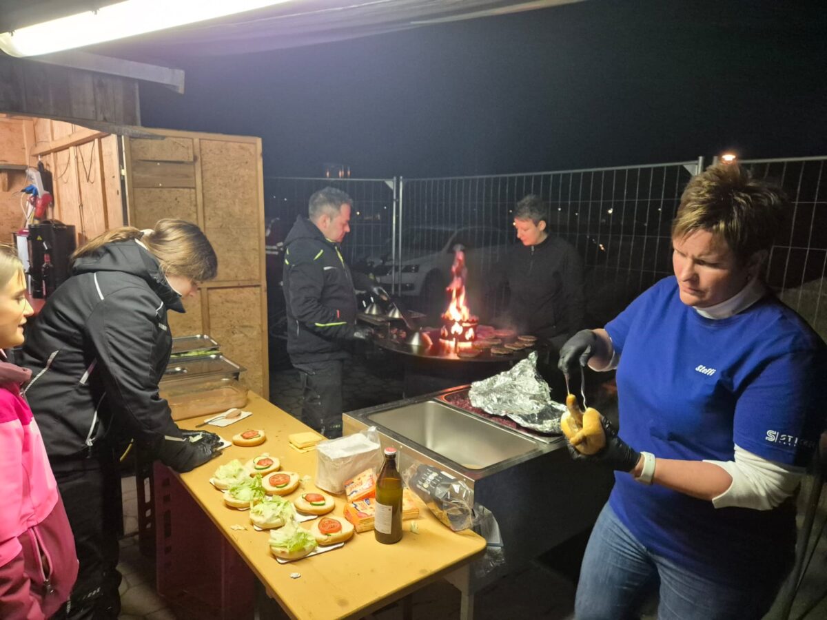 Wetterglück ermöglichte vielen auch das Verweilen im Freien an Stehtischen mit Feuertonne. Selbstgemachte Kirwaburger erwiesen sich als der große Renner beim kulinarischen Angebot. Bis zum Morgengrauen dauerte die zünftige Feier. Solange bewachten Burschen im stündlichen Wechsel das Kirwa-Wahrzeichen.