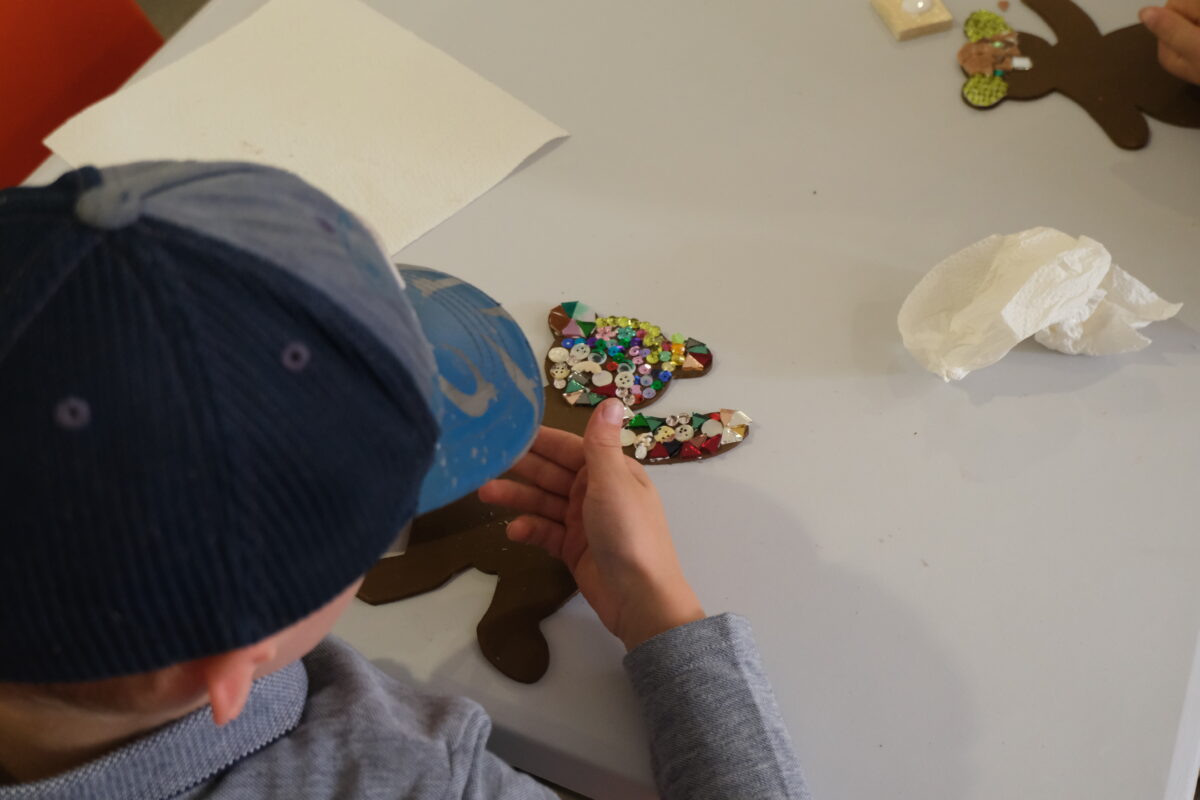 Schon bei der Begrüßung wurde klar, dass der Knopf weit mehr kann, als nur Kleidung zusammenhalten. Die vielen verschiedenen Formen, Farben und Materialien eignen sich ideal zum Basteln und Fädeln. Die Tirschenreuther Künstlerin Kerstin Rumswinkel bereitete passend zum Bärnauer Stadtwappen Bären aus Holz vor, die mit Glasstücken, Perlmuttrondellen aus der Knopfproduktion, Knöpfen und vielem mehr dekoriert werden konnten. Mit großem Eifer und viel Fantasie gestalteten die Kinder ihre Bären. Von ganz natürlich braun über kunterbunt und glitzernd war alles dabei. Sogar Latzhose, Gummistiefeln und Handtaschen durften bei manchen nicht fehlen. Die Freude über die schönen Bärenmosaike war groß.