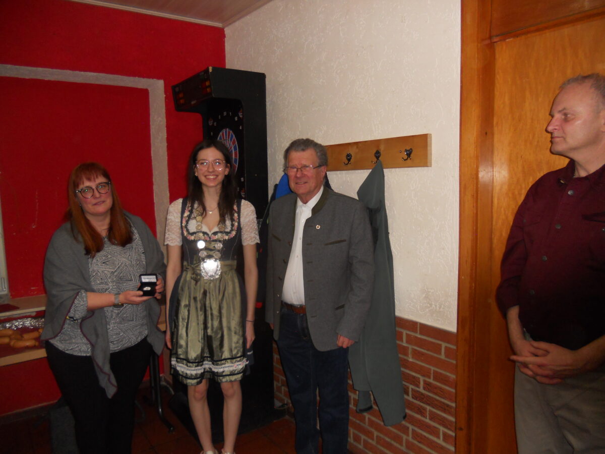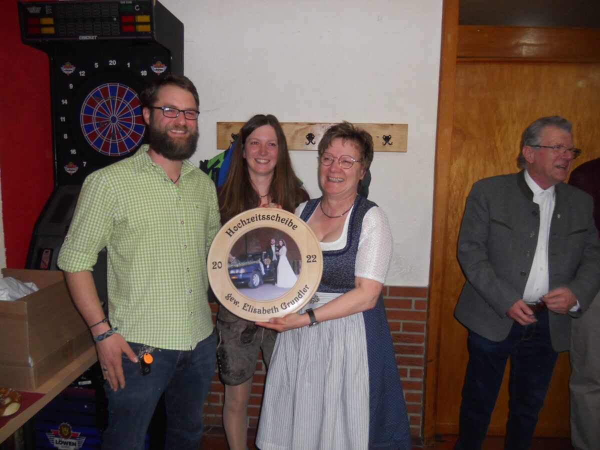 Die Hochzeitsscheibe, gestiftet von dem jungen Ehepaar Johannes und Anna Trottmann, durfte Elisabeth Grundler mit nach Hause nehmen. Dann erfolgte die mit Spannung erwartete Proklamation der Könige. Bei der Jugend hatte sich den dritten Platz Luca Preisinger ergattert. Er erhielt eine Brezenkette. Der zweite Platz fiel an Sophie Högen. Sie bekam eine Wurstkette. Und die neue Schützenkönigin in der Jugend heißt Emma Meiler. Mit einem 75,9 Teiler erschoss sie sich den ersten Platz. Sie erhielt außer der Kette noch eine 20 Euro Sondermünze, gestiftet von Felix Stark.