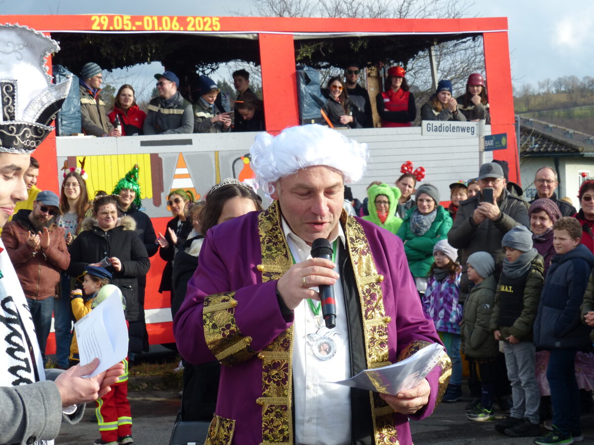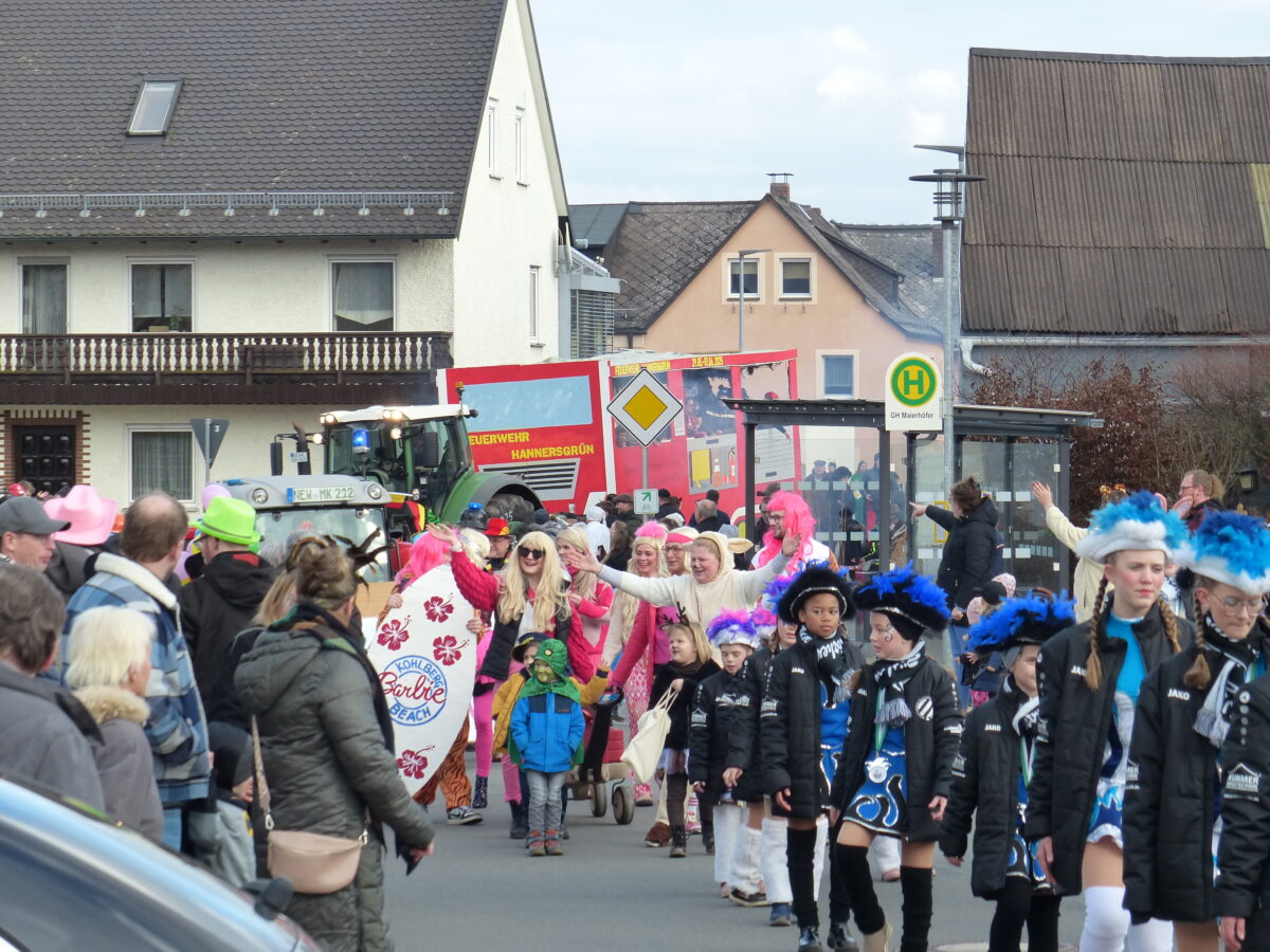 Der Festwagen des SV Kohlberg führte den Zug ab der Schule an, mit an Bord war das Prinzenpaar. Gefolgt wurde das Gefährt von den Garden, die die Zuschauer am Straßenrand anheizten. Die Feuerwehr folgte mit ihrem Prunkwagen. Die Feuerwehr aus Hannersgrün hatte nicht nur den größten Wagen, sie übermittelten damit zwei wichtige Botschaften. Zum einen das Jubelfest in 2025 und die Neuanschaffung eines TSF, anstelle Tragkraftspritze. Die SV-Jugend füllte einen weiteren Wagen aus. Mit ihrem Betreuer Herbert Riedel sorgten auch sie für Stimmung. Von allen Wägen prasselten Süßigkeiten auf die Zuschauer hernieder. Besonders die Kinder am Rande der Straße sammelten fleißig ein. Die Eltern und Großeltern fungierten als Träger der gesammelten Gegenstände. Am Rathaus angekommen wurde erst mal der Bürgermeister Gerhard List von den Gardemädchen gefesselt und in Gewahrsam genommen und auf dem Festwagen abtransportiert.