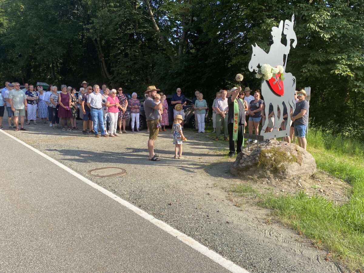 Der St. Jodok-Ritt steht vor der Tür und wurde am späten Sonntagnachmittag traditionell mit einem Konzert an der Wallfahrtskirche eröffnet. Zuvor segnete Pfarrer Wilhelm Bauer ein auf dem Parkplatz postiertes Reiter-Standbild als Symbol des St. Jodok-Rittes. Initiator und Ideengeber war einmal mehr Hans Ebnet, unterstützt von „Designer“ Josef Grötsch und dem Vorsitzenden des Förderverein St. Jodok-Ritt Benedikt Uhlemann.