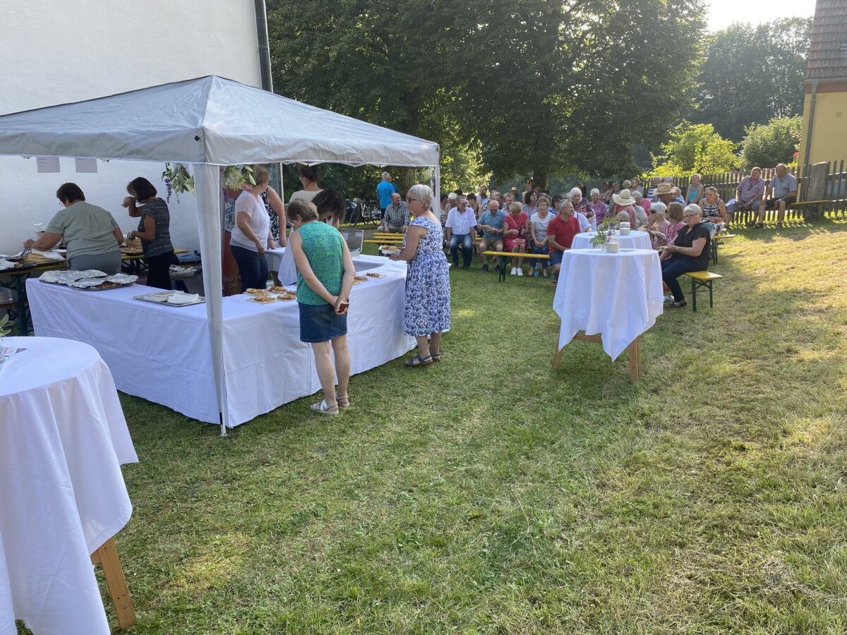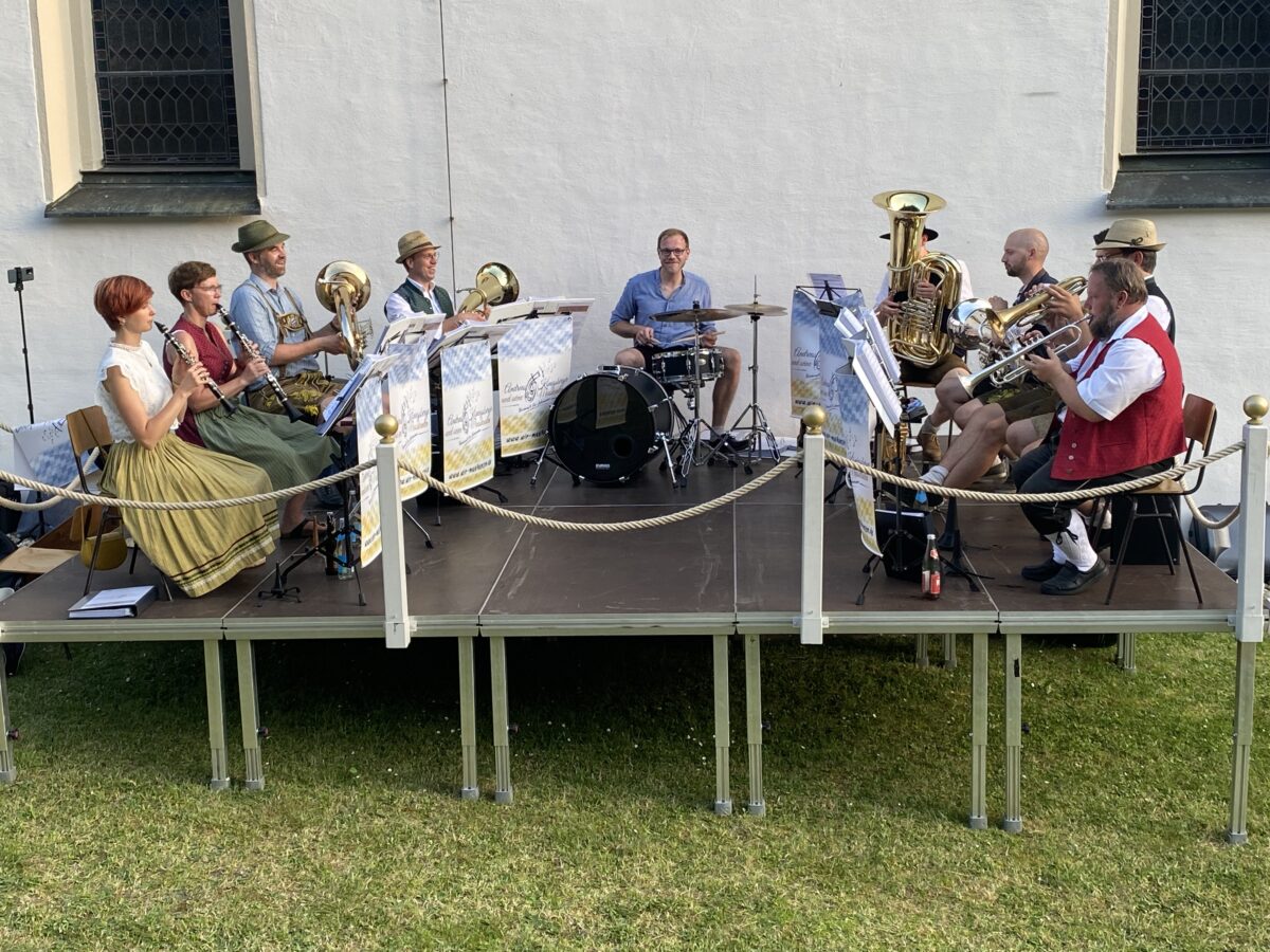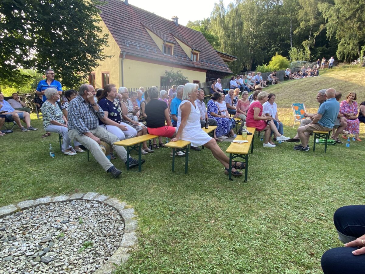 Bei idealen Sommertemperaturen spielten „Andreas Königsberger und seine Musikanten“ Bayrisch-Böhmische Melodien, die bei den zahlreichen Besuchern schnell zum Mitklatschen anregten. Viele hatten sich ein sonniges Plätzchen auf der tribünenhaften Wiese gesucht, die meisten zogen es aber in den Schatten der Lindenbäume. Zur Stimmung und guten Laune trugen auch die Damen der Gymnastikgruppe bei, die alle Hände voll zu tun hatten, um den Durst der Besucher zu stillen.