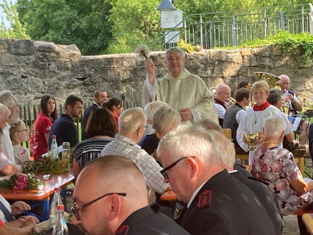 Diesmal wurden die Kräuterbüschel auf der größten Burganlage der Oberpfalz gesegnet. Beim Gottesdienst anlässlich des Bürgerfestes, zu dem die örtliche Feuerwehr eingeladen hat, wurde auf der Burg zelebriert. Für Pfarrer Adam Nieciecki war es der letzte Freiluftgottesdienst, denn er geht ab 1. September in Ruhestand in seine Heimat Polen. Er stellte in der Predigt heraus, dass wir uns feiern und dabei gemeinsam feiern. Er ging auch auf die Kräuter zum Maria Himmelfahrtstag ein und dankte dem Katholischen Frauenbund (KDFB) für die Mühen. Nach dem Festgottesdienst ging der durch die Reihen und segnete die Kräuterbüschel. Am Tag zuvor hatten Mitglieder des KDFB mit Vorsitzender Claudia Rupprecht über siebzig Kräuterbüschel gebunden.