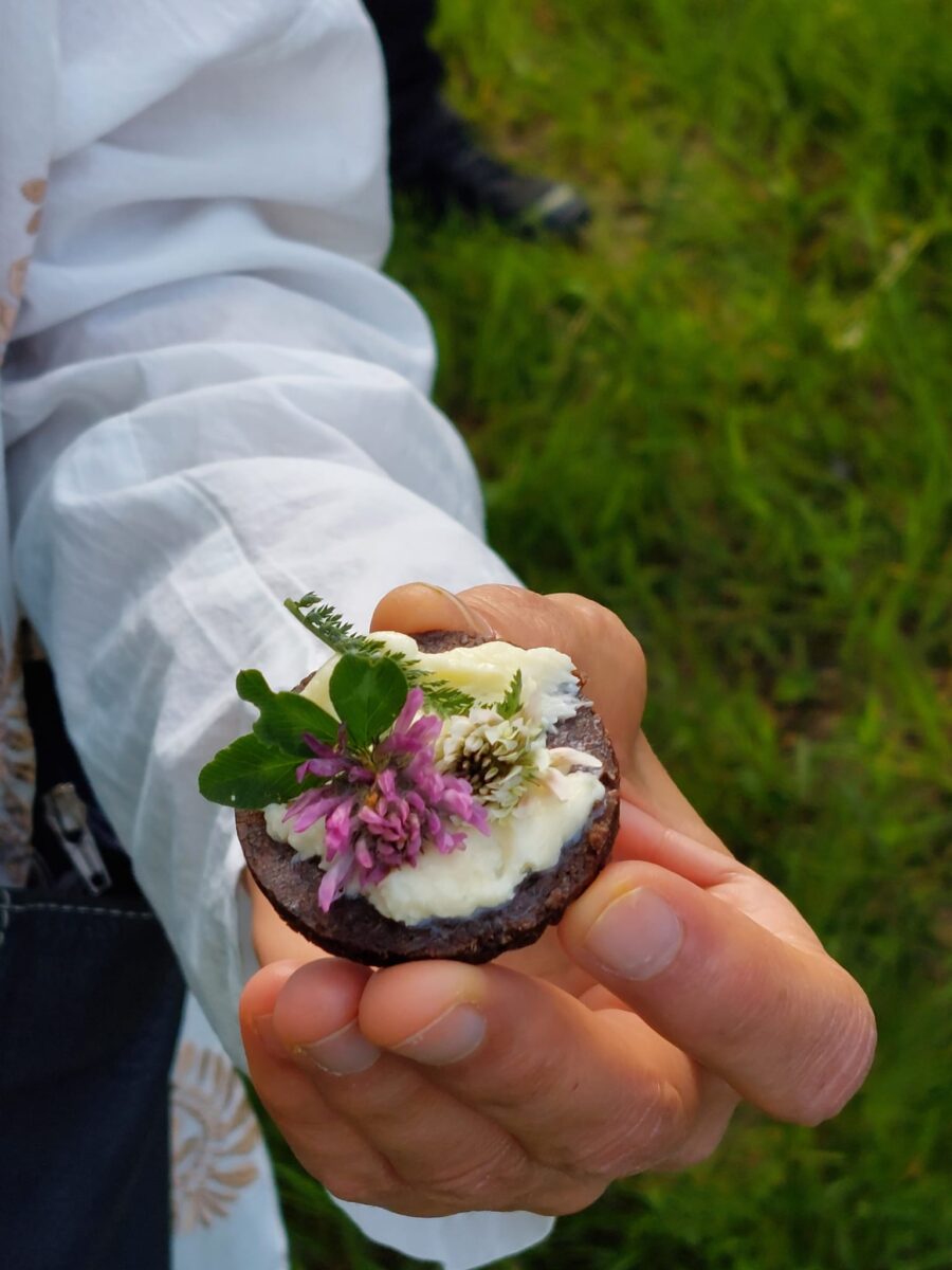 Nach dem Sammeln der Kräuter durften die Teilnehmer aus einer, von der Kräuterführerin, mitgebrachten flüssigen Sahne im Glas durch kräftiges Schütteln die Butter für den Kräutersnack herstellen. Auf kleinen Vollkornbroten wurde die frische Butter mit den gesammelten Kräutern zu einem leckeren Imbiss zubereitet.