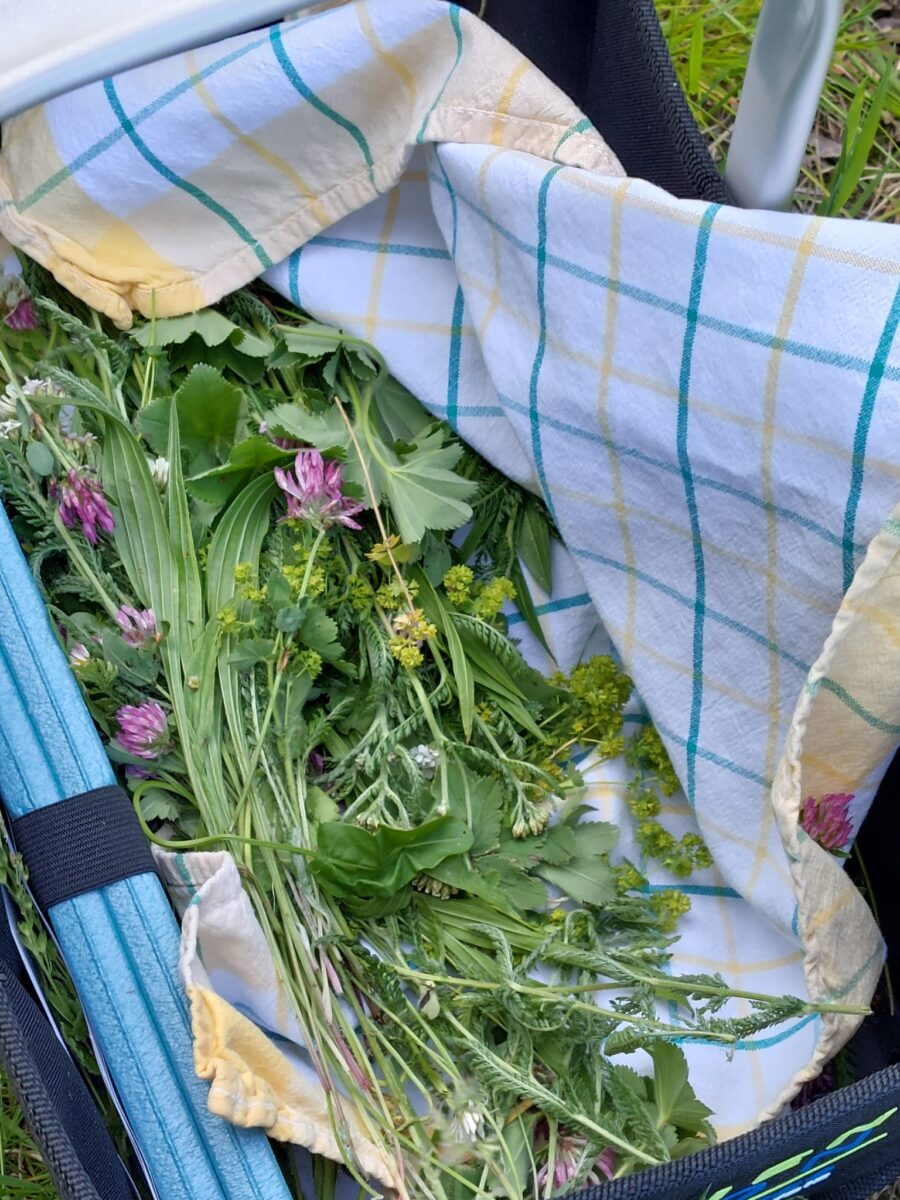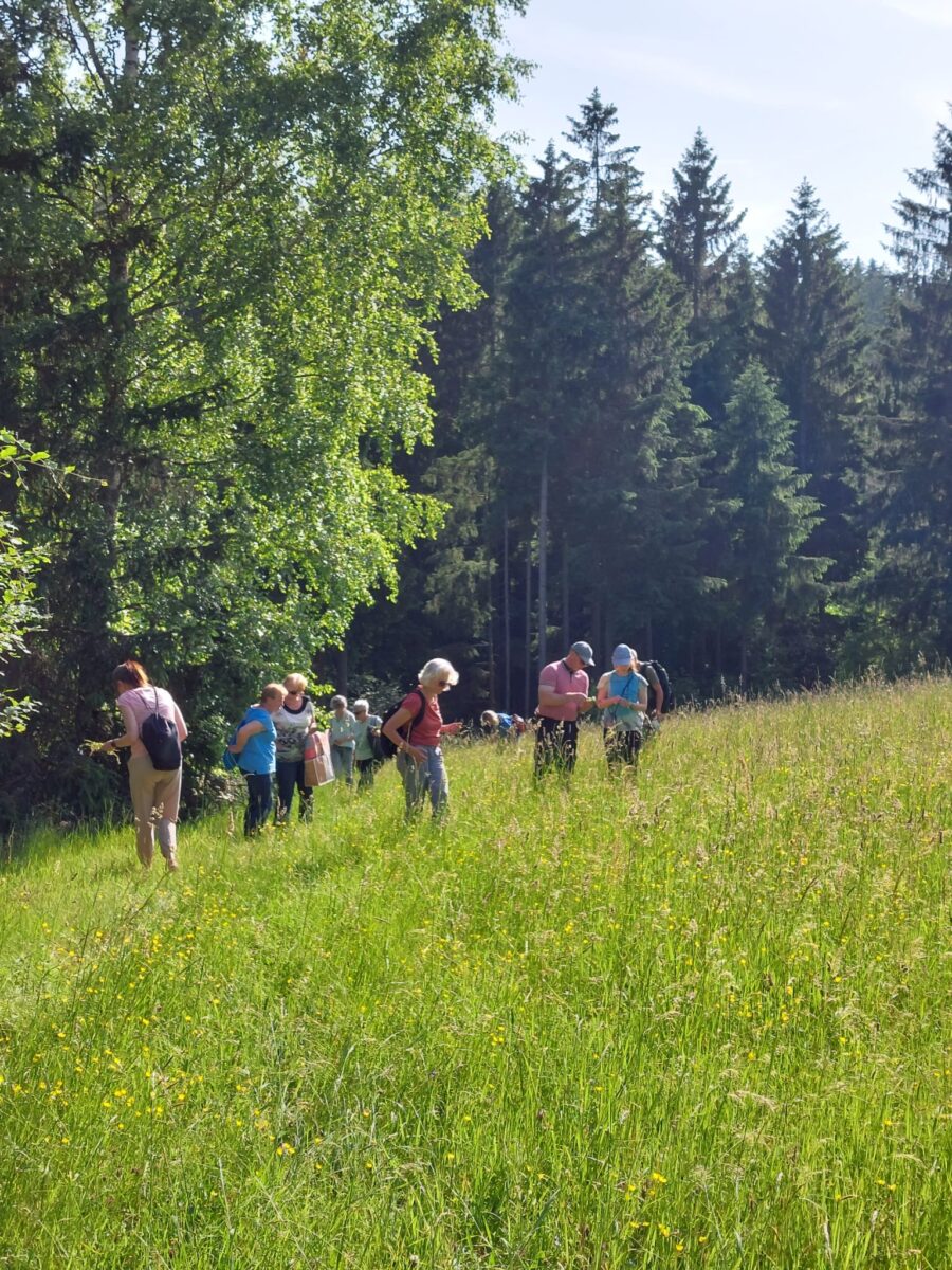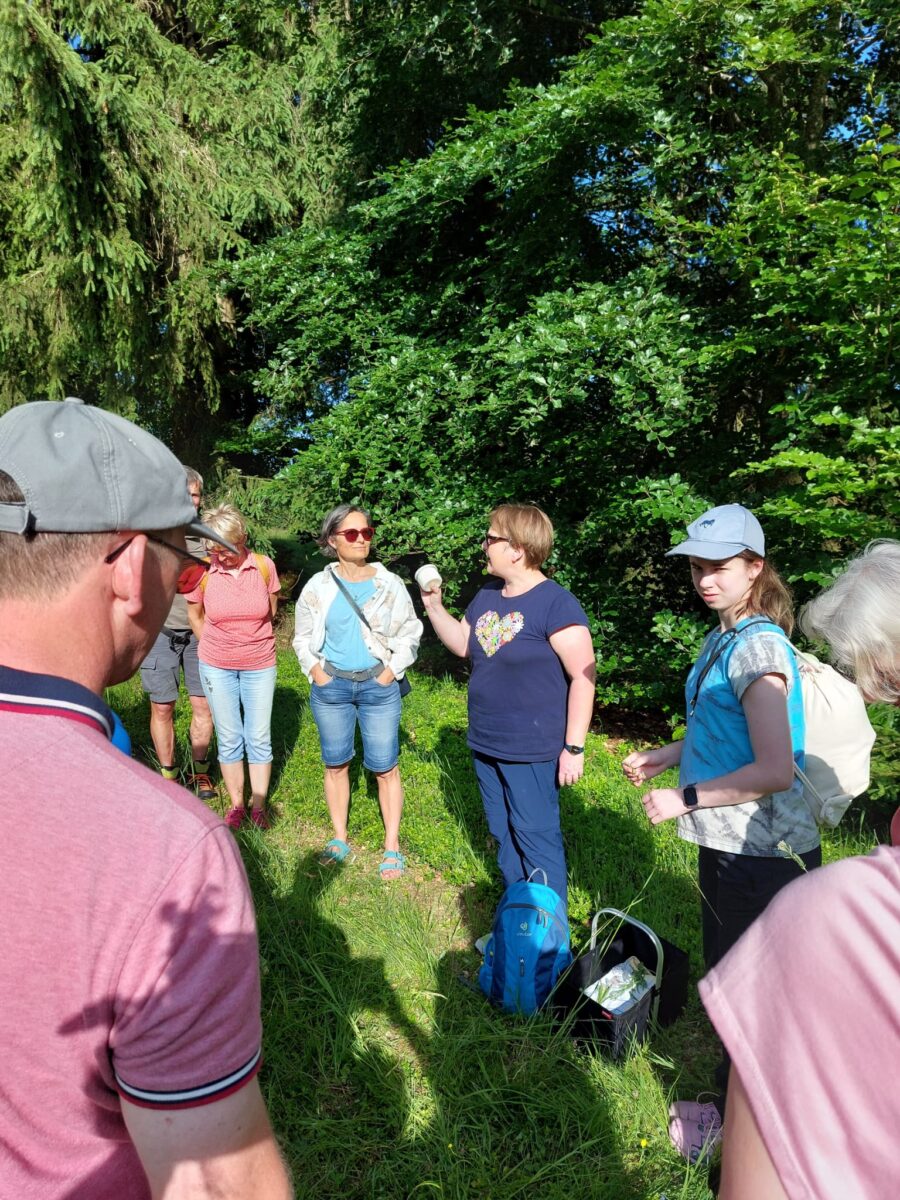 Die Teilnehmenden lernten Kräuter am Wegesrand kennen – durch Duft, Geschmack und Anwendungstipps. Wichtiger Tipp der Wildkräuter-Expertin, besonders für Einsteiger: Erst eine Handvoll Wildkräuter kennenlernen und gezielt sammeln, um Sicherheit bei der Bestimmung zu bekommen. Wenn man nämlich mal richtig hinschaut auf eine Wiese, sieht man dort eine Unzahl von verschiedenen Pflänzchen.