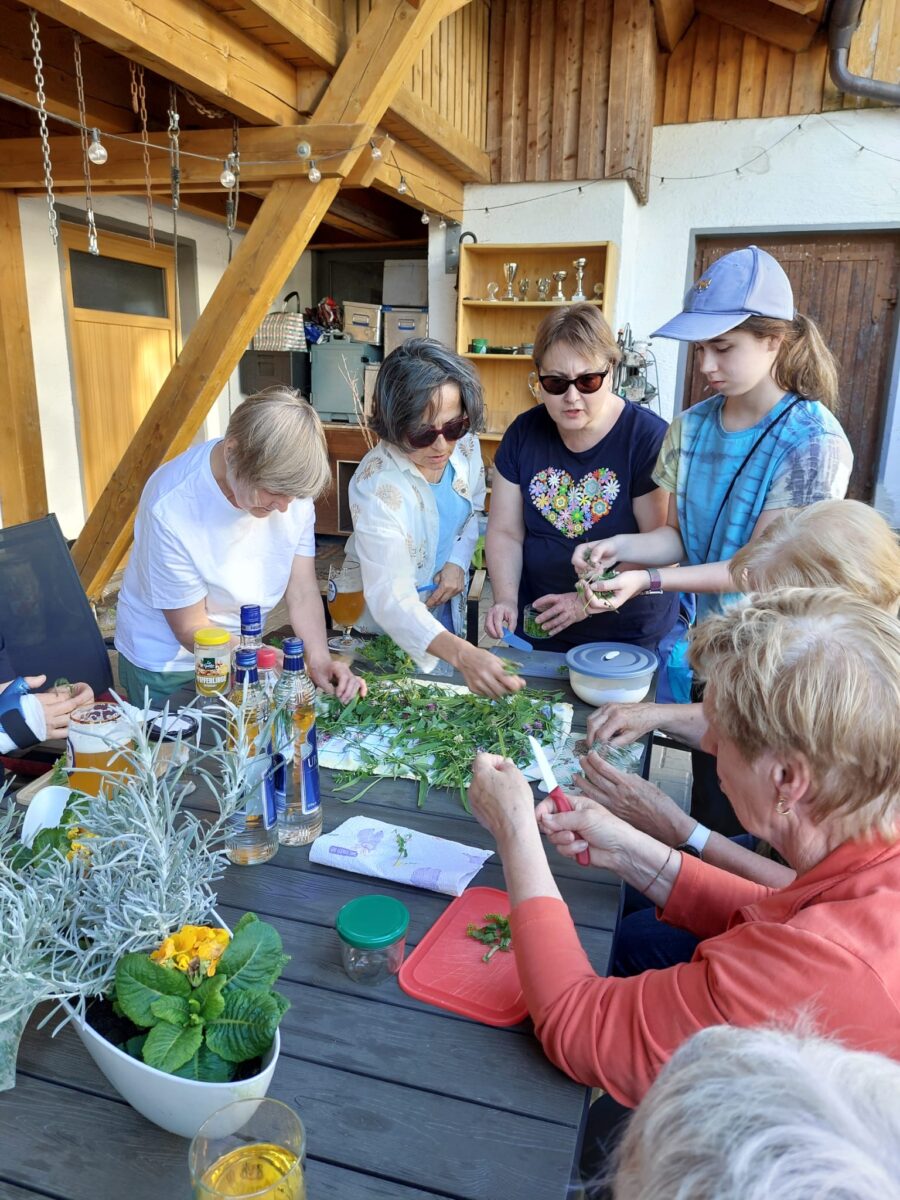 Neben dem Sammeln und Entdecken der Wildkräuter lag der Fokus des Wildkräuter- und Waldsparzierganges natürlich auch auf dem Erleben des Waldes, seiner Geräusche und Gerüche. Mit einer Meditation mit dem Titel „Ein sonniger Tag“ konnte die Kräuterführerin die Teilnehmer nochmals die Magie des Waldes vor Augen halten und zur Entspannung der Kräutersammler beitragen. Nach ungefähr zwei Stunden kehrte die Gruppe zum St. Ötzener Hof ein, wo die gesammelten Kräuter unter Anleitung von Sabine Zenger Urtinkturen und Kräuterquark draußen am großen Tisch in der Sonne verarbeitet wurden.