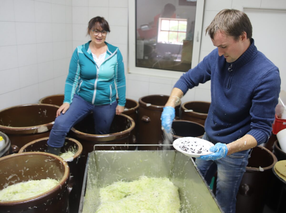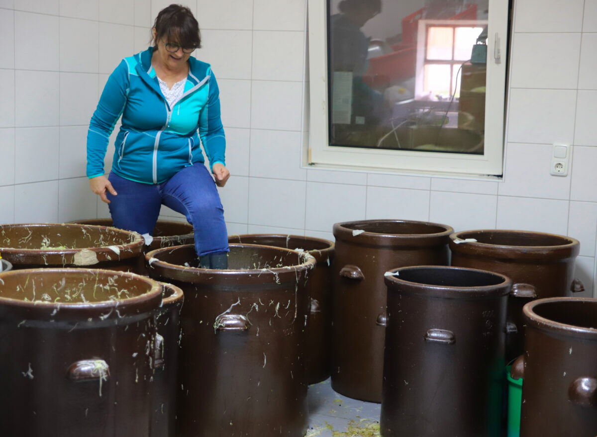 „Der Arbeitsprozess ist Knochenarbeit – mit vier Leuten benötigen wir unter Volldampf eine Stunde rund zehn Zentner“, so der Bauer. Die Senior-Chefin prüft auch in etwa 14-tägigem Rhythmus den Gärvorgang und steuert bei Bedarf mit ein wenig Wasser nach. Bei der Gärdauer geht man von vier Wochen aus.