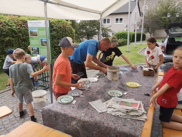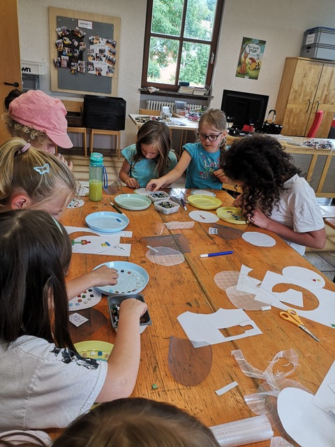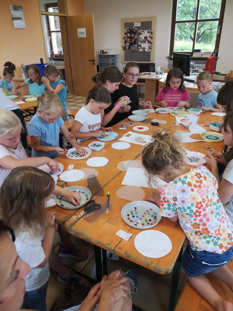 Zu Beginn des Programms durften die Kinder unter Anleitung Mosaik-Betonscheiben gießen, eine Tätigkeit, die sowohl Spaß machte, als auch die Feinmotorik förderte. Für die Herstellung des Betons bekam das Team Unterstützung von Franz Wünsche, der mit seinem Fachwissen dazu beitrug, dass die Arbeiten reibungslos vonstattengingen.