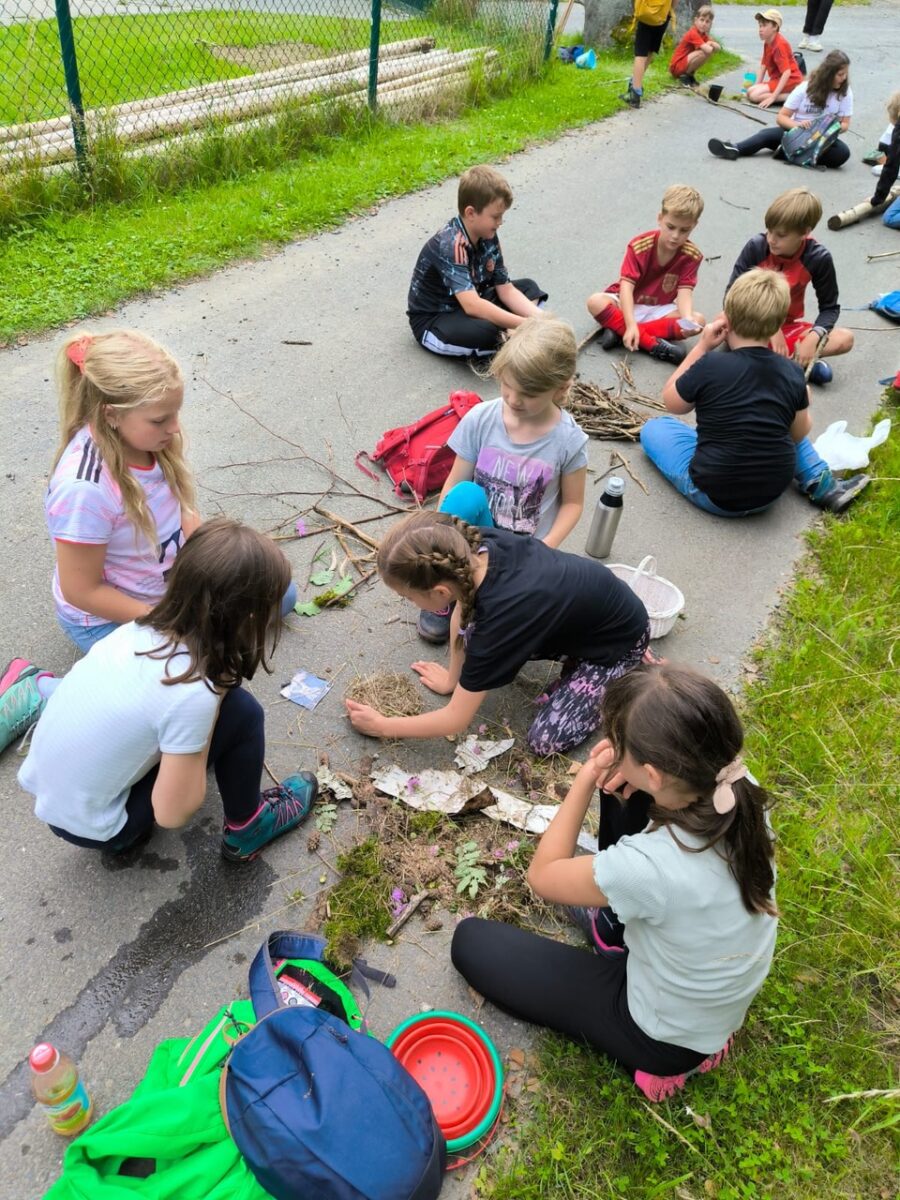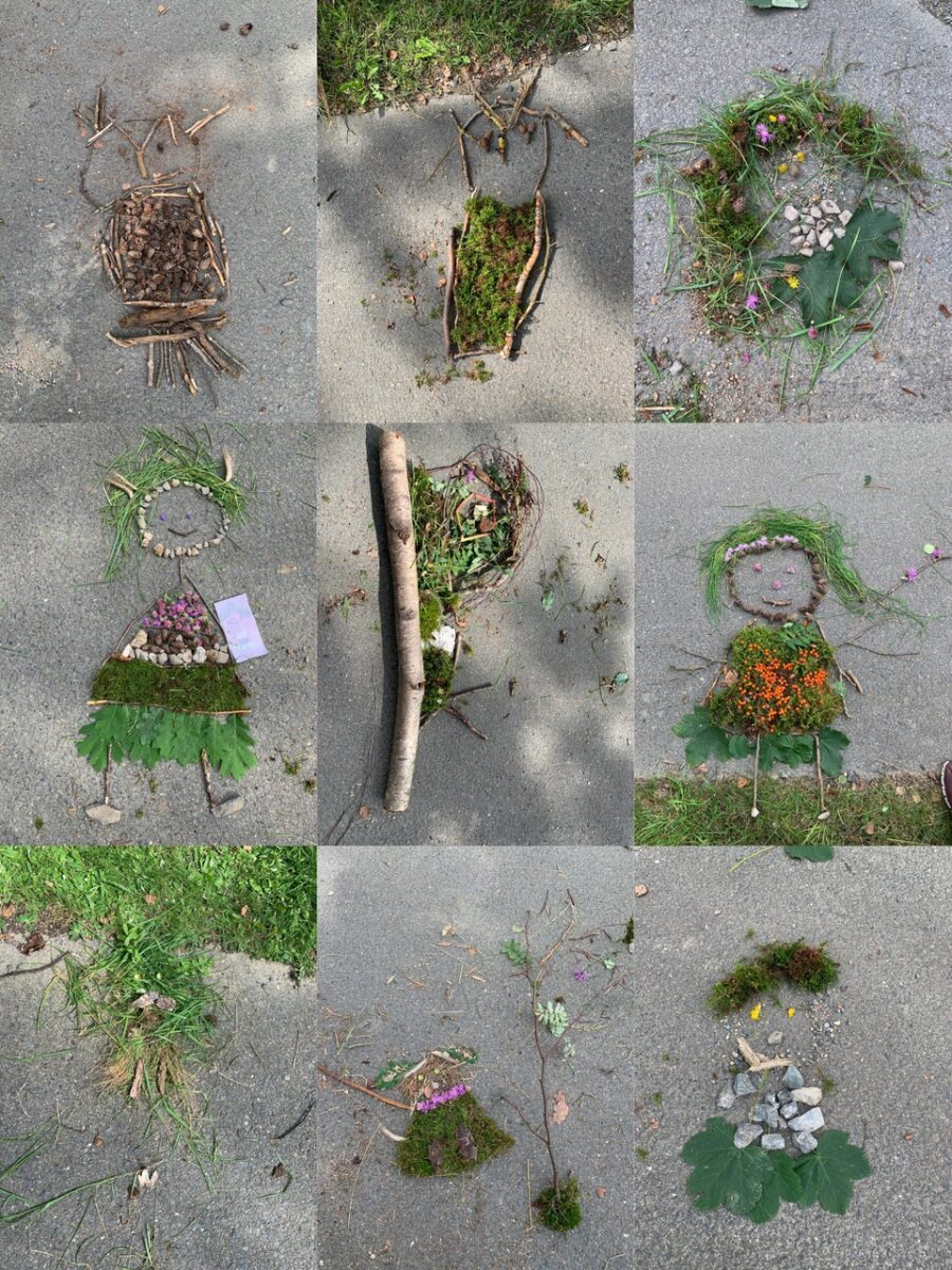 Von da aus ging es zu Fuß zum Teufelsbutterfass, um viele Naturmaterialien zu sammeln. Die Kinder waren eifrig beim Suchen, denn jeder wollte die meisten Naturprodukte, wie Steine, kleine Zweige, Blumenstiele, Moos und alles, was natürlich herumlag, einsammeln. Sie wussten, dass sie aus den Kleinmaterialien ein Puzzle herstellen dürfen. Nachdem ihre Behälter teils mit vielen und auch mit wenigen Teilen gefüllt waren, ging es zurück zum Vereinsheim. Hier wurde alles ausgeschüttet und es ging ans Werk. Mit viel Geduld, Einfallsreichtum und künstlerischem Geschick stellten die Mädchen und Jungs wahre Naturkunstwerke (Puzzle) her. Die Leiterinnen staunten und lobten die Ferienkinder, dass sie so viel Talent an den Tag legten.