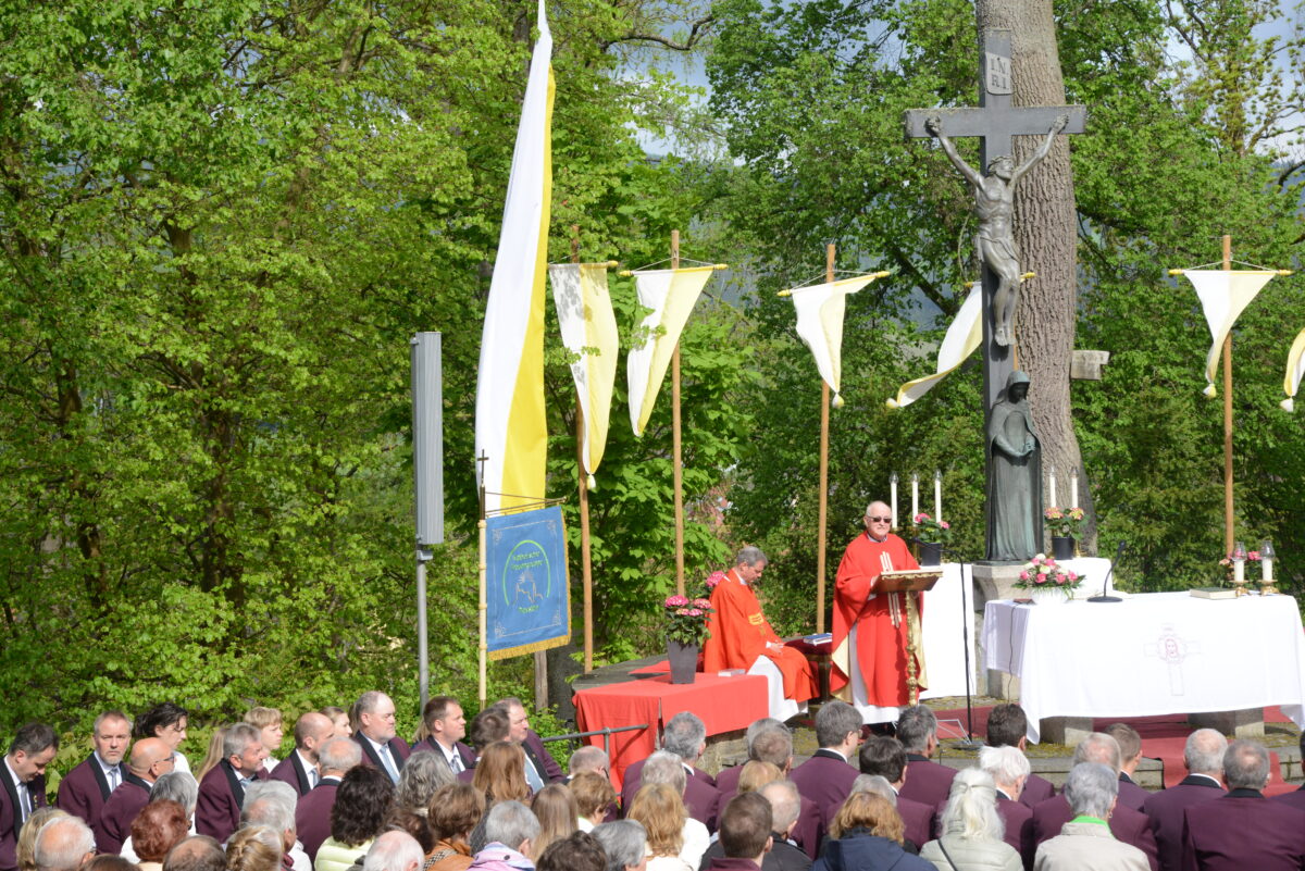 Pater Thomas Mühlberger hieß die Besucher des Festgottesdienstes auf dem Kreuzbergplateau willkommen. Er zeigte seine Freude über die bestens angenommene wunderschöne Lichterprozession am Abend vorher, aber auch für das trockene Wetter zum Festgottesdienst im Freien auf dem Plateau, was auch den „besonderen Charme“ dieses Festtages ausmache.