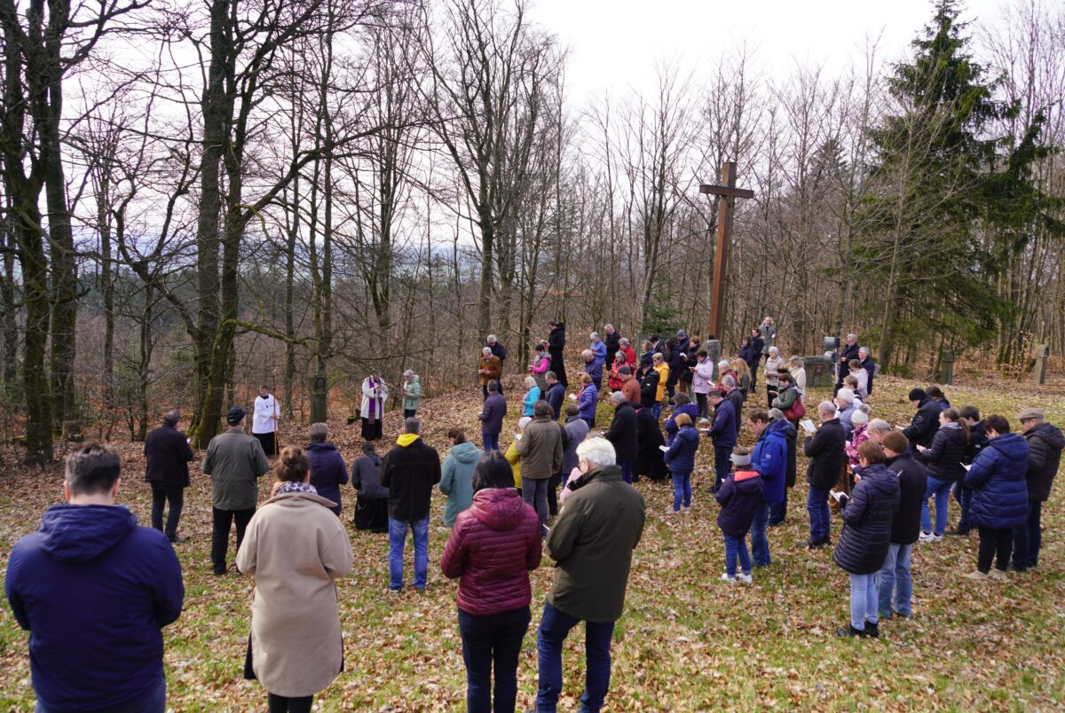 Angefangen von der Dreifaltigkeitskapelle führte der Weg über die Kreuzwegstationen am Freialtar vorbei zur Wallfahrtskirche Mariä Heimsuchung. Junge und ältere Christen lasen an den einzelnen Kreuzwegstationen die Betrachtungen und Gebetsanliegen. Die Teilnehmer, unter ihnen Mitglieder der Marianischen Männerkongregation (MMK) hinterließen so betend ein Glaubenszeugnis zur Vorbereitung auf Ostern. “Vergelt`s Gott fürs Mitbeten, Vorbeten und das Mitgehen”, sagte der Geistliche.
