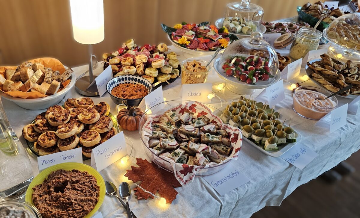Passend zum literarischen Programm bot das Büchereiteam eine Auswahl erlesener Weine an. Die Gäste konnten zwischen fruchtigen, süßen oder trockenen Weinen wählen, aber auch die Freunde des Hopfens wurden fündig. Ergänzt wurde das Angebot durch ein liebevoll angerichtetes Buffet mit kleinen Häppchen – von Käsespießen über verschiedene Dips bis hin zu herzhaftem Fingerfood und Kuchen.