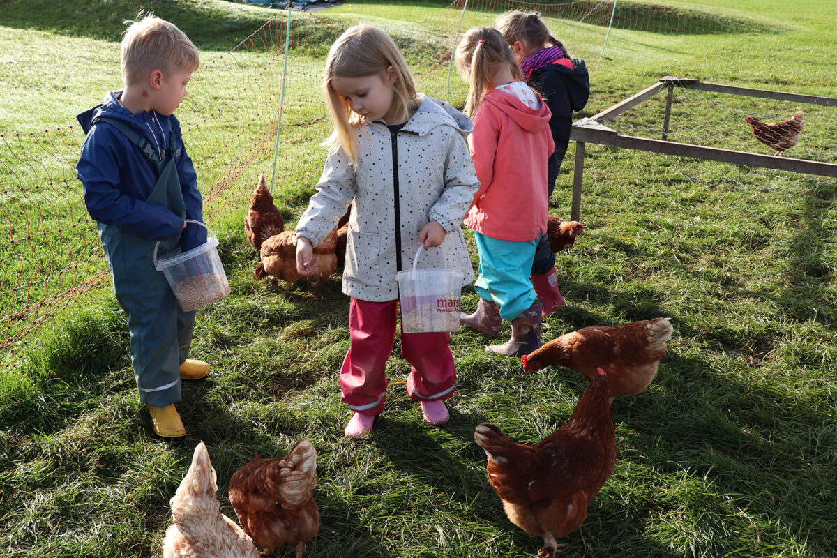 Kühe, Kälber, Hühner - keine Berührungsängste bei den Kindern