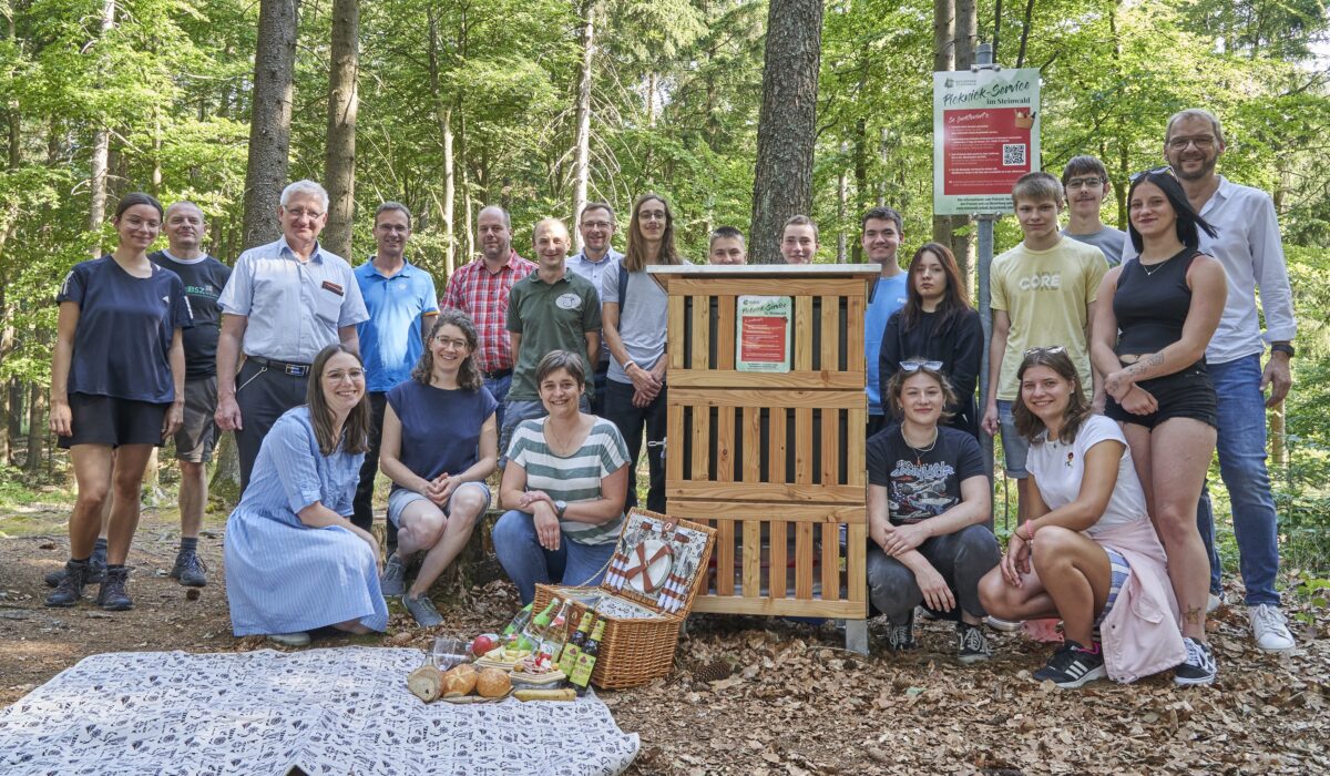 Bei einem Treffen am Zipfeltannenfelsen im Steinwald begutachteten die angehenden Schreiner der staatlichen Berufsschule aus Wiesau ihre Holzkonstruktion, in die ab sofort Körbe mit kulinarischen Schmankerl auf Bestellung geliefert werden.