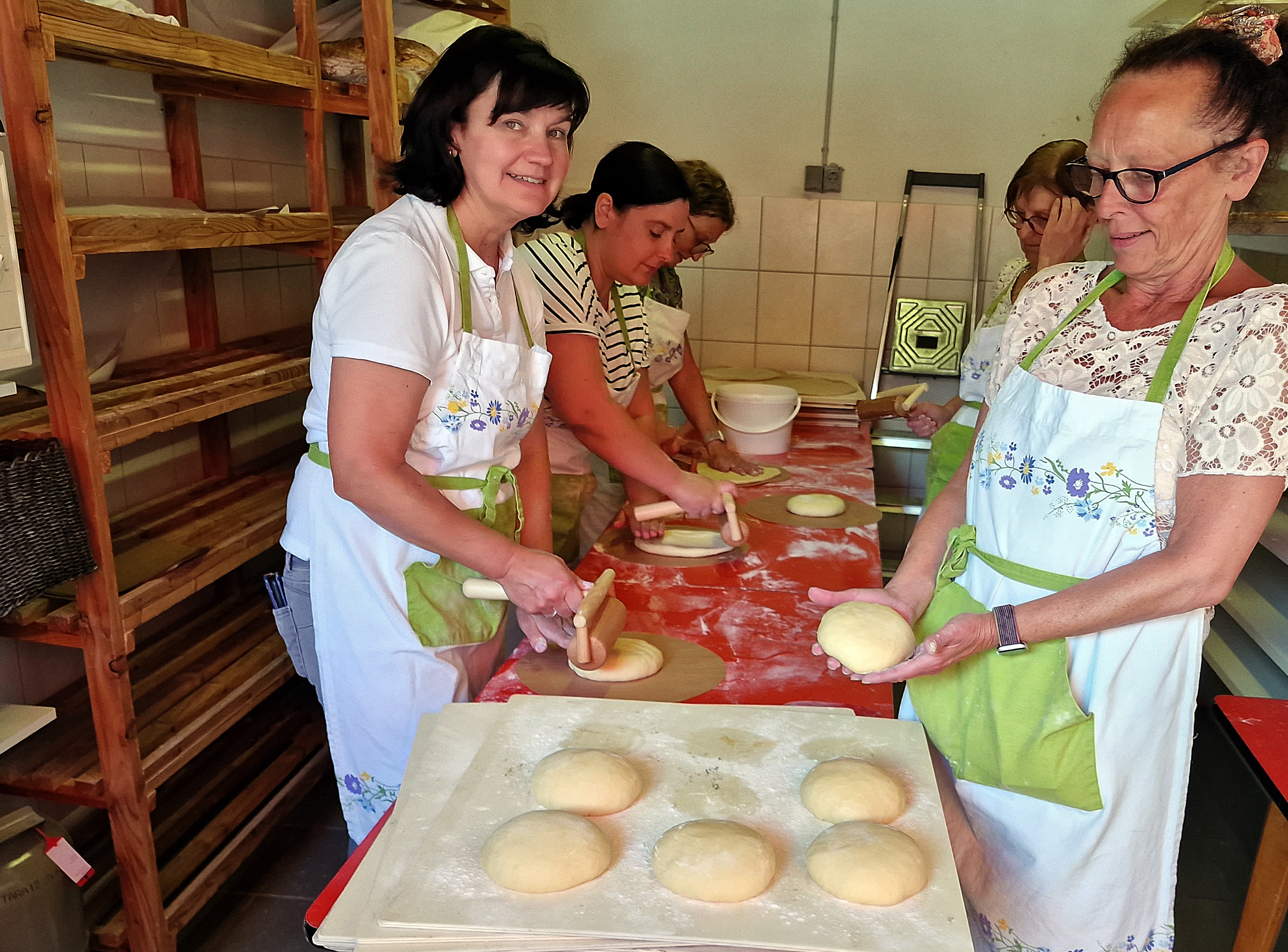 Nach dem Mittagessen feuerte Rudi Kreuzer und sein Vize Karl Heinz Thoma als Bäcker den Ofen wiederum an. Die vorbereiteten Sauerteigbrote, welche die Damen um Michaela Treml und Sonja Gaßner schon abgewogen und geformt hatten, wurde mit Schießern in den Ofen geschoben. 60 Brote wurden gebacken und alle Kunden befriedigt, die Brote vorbestellt hatten. Schon am Samstag knisterte Holz im Ofen, insgesamt waren 120 Schmier-, Klecksel-, Käs-, Zwiebel- und Mohnkuchen gebacken.