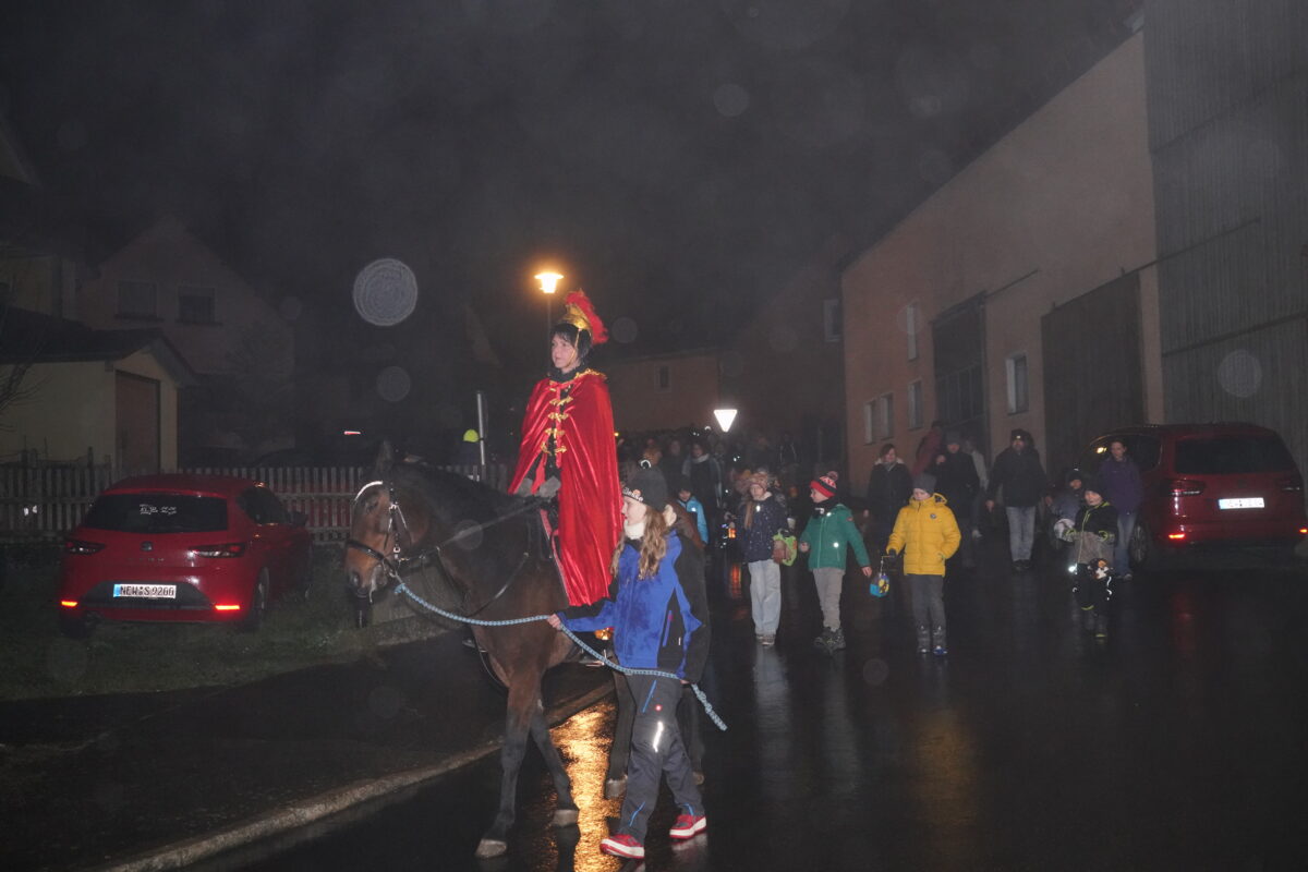 „St. Martin ritt durch Schnee und Wind“ sangen die Kinder und die Bläsergruppe Waldthurn spielte dazu“. Hoch zu Pferde führte der berittene Patron –verkörpert von