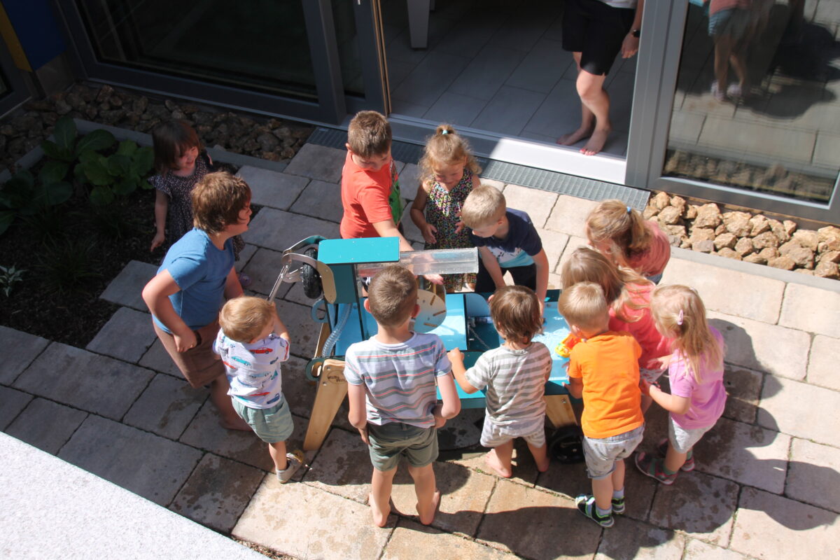 Einen Wasserlauf sahen die Erzieherinnen bei der Planung des Gartenspielbereiches als nicht sehr sinnvoll, zumal man gerade in den letzten regenarmen und heißen Sommern immer wieder ans Wassersparen denken musste. Schon länger überlegte deshalb die Kinderhausleitung den zwar nicht ganz günstigen, aber dafür sehr nachhaltigen Wellenspieler anzuschaffen.