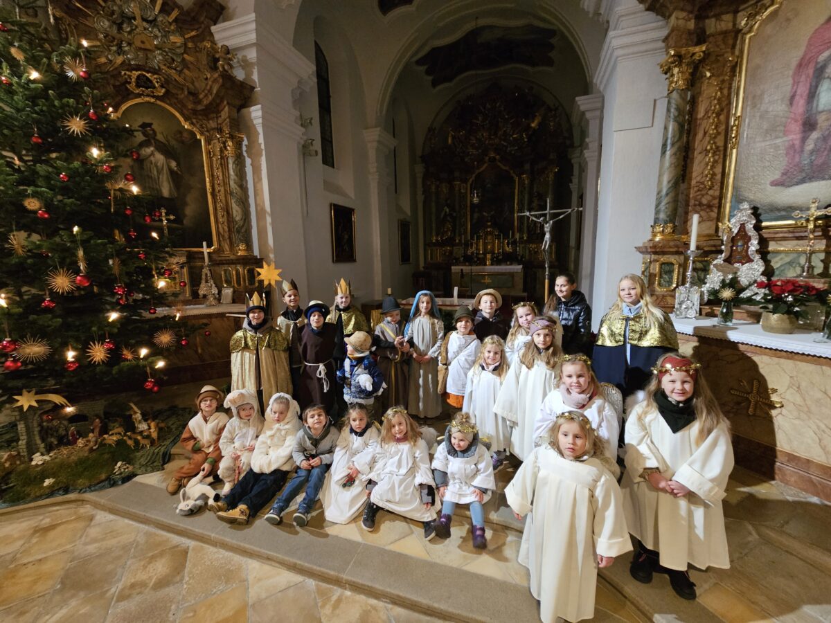 Die „kleinen Stars“ des Krippenspiels sind: Eva Saller, Jonas Eiberweiser, Mathilda Kiener, Amy Stahl, Fabian Schmid, Milan Kiener, Franz Schmid, Simon Bock, Leon Ertl, Sam Stahl, Johann Schmid, Sofie Biehler, Luisa Hösl, Mia Meier, Lea Magdalena Feneis, Isabella Ogarek, Luise Kiener, Lena Schmid, Sarah Wirth, Luzia Feneis, Laura Namberger, Lilli Hösl, Jonas Ogarek, Lukas Bock und Zoey Stahl.