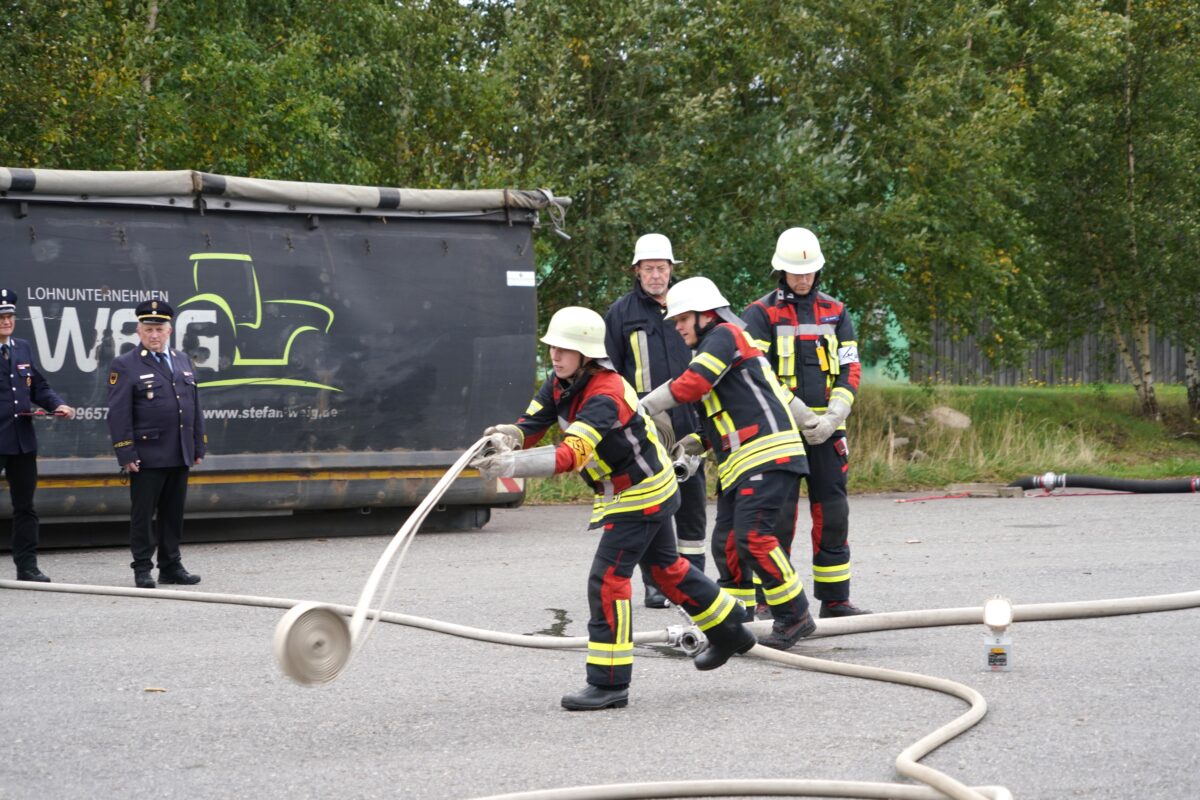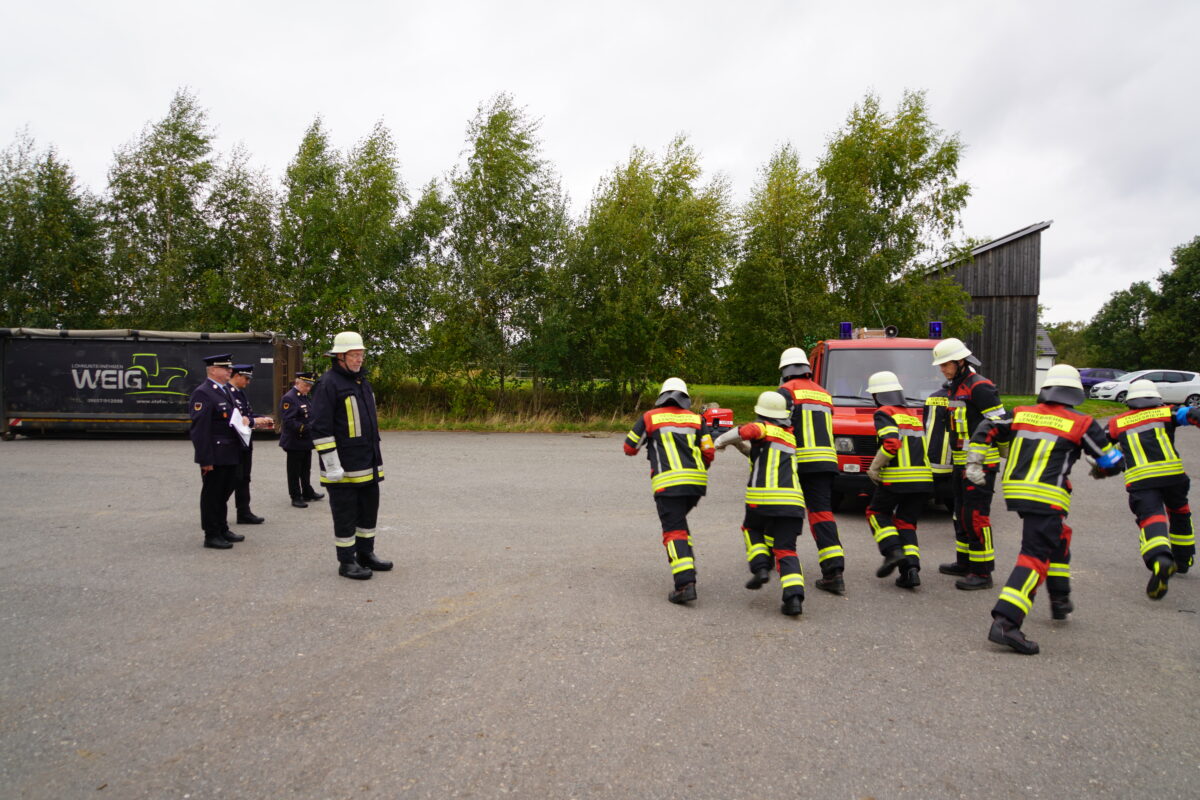 „Die Gruppe im Löscheinsatz“ zeigte am Areal von Lohnunternehmer Stefan Weig in Albersrieth ihre Geschicklichkeit und den hohen Ausbildungsstand.