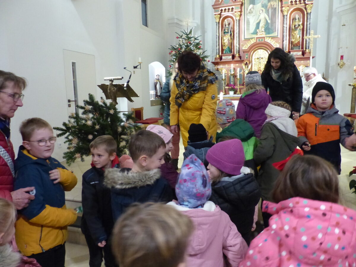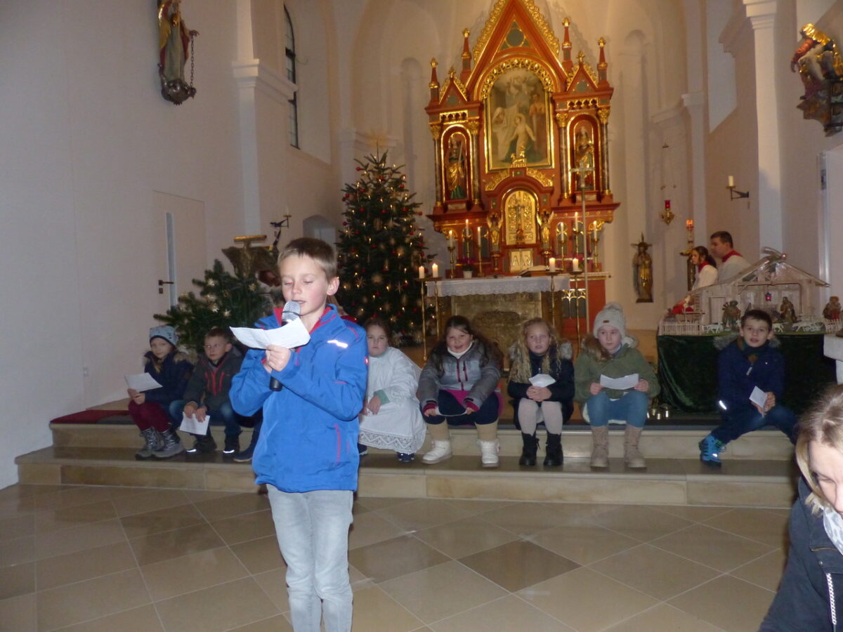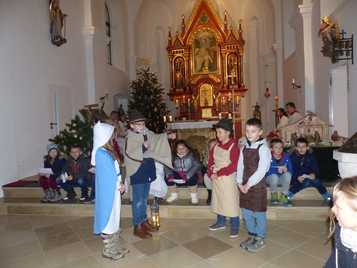Pfarrer Adam Nieciecki hatte die Idee für das Krippenspiel, die Eltern der Kommunionkinder sorgten dafür, dass dafür geprobt wurde und führten dann auch Regie bei der Aufführung am Heiligen Abend. Mit den Weihnachtsliedern aus dem Gotteslob, von Josef und Veronika Hirmer instrumental begleitet, wurde das Krippenspiel umrahmt. Die Mädchen und Buben, die vor dem Volksaltar Platz nahmen, traten einzeln hervor und trugen Absätze der Weihnachtsgeschichte vor, die auch noch zusätzlich auf einer Leinwand bildlich dargestellt wurde. Bald darauf erschien Josef und Maria, die von draußen kamen und baten beim Wirt um Herberge.