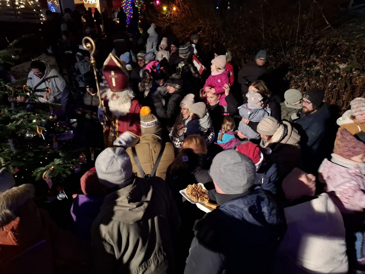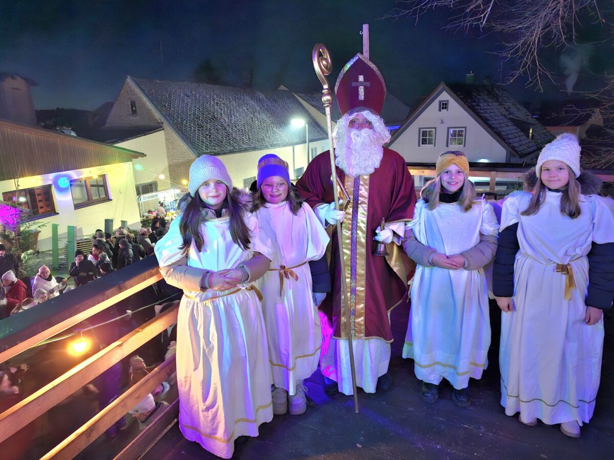 Auch wenn Weihnachten noch einige Wochen entfernt ist, überraschte Dritter Bürgermeister Bernd Reil als Nikolaus die Erwachsenen und Kinder. Den bärtigen Mann im roten Gewand und mit Bischofsmütze begleiteten Anna, Lea, Theresa und Emma als Engel. „Ich wünsche mir in diesem Jahr mal Weihnachten, wie es früher war, kein Hetzen zur Bescherung hin, ein Stück warme Menschlichkeit und vor allem ein Miteinander-Lachen und ein warmes Herz“, formulierte der Nikolaus auf der Bühne.