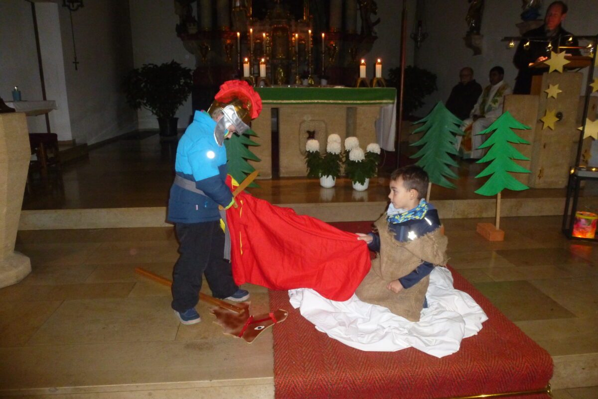 Die feierliche Eröffnung wurde von den Stimmen der Kinder des Kindergartens St. Martin bereichert. Mit Liedern wie “Ein bisschen wie Sankt Martin möchte ich sein, dann scheint mein heller Schein in die dunkle Welt hinein” stimmten sie die Gemeinde auf das Thema der Veranstaltung ein. Pater Prince Kalarimuryil und Pfarrer Matthias Weih vereinten in ihren Ansprachen die Geschichte und die Aktualität des heiligen Martins. Besonders eindrucksvoll war die pantomimische Darstellung der Mantelteilung durch Jakob Koppmann und Raphael Malzer, zwei Mitglieder der Gemeinde, die das selbstlose Handeln des Heiligen nachstellten.