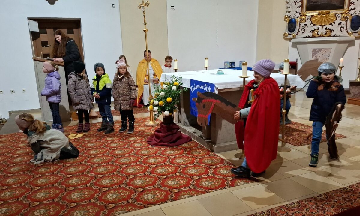 Seit Tagen probte Erzieherin Katrin Bruckner mit den Vorschulkindern die Aufführung. Den Wortgottesdienst in der voll besetzten Pfarrkirche “Mariä Himmelfahrt” gestaltete Pfarrer Udo Klösel, und die Mädels und Jungs vom Kindergarten zogen mit dem Martinslied „Laterne, Laterne, Sonne, Mond und Sterne“ im Klang der Gitarre von Marie Hummer in die Kirche. Pfarrer Klösel erinnerte an die guten Taten des Heiligen Martin, wie er den Menschen geholfen hat, und an die Nächstenliebe. „Auch wir wollen miteinander helfen und teilen, wie Sankt Martin.“ Die Geschichte sichtbar werden ließen die Vorschulkinder unter der Leitung von Erzieherin Katrin Bruckner.