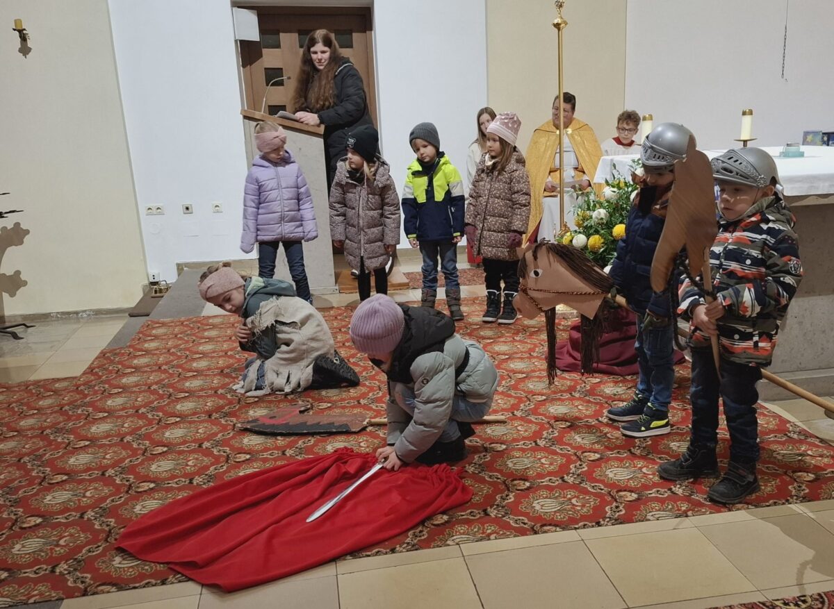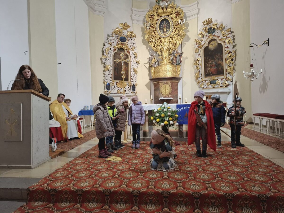 Die Bevölkerung, dargestellt durch Kinder, belächelte den frierenden Bettler (Darstellerin Mathilda), doch Soldat Martin (Darstellerin Lotta) legte mit seinem Reitertross einen Halt ein. Er teilte mit dem Schwert seinen roten Mantel und überreichte die eine Hälfte dem frierenden Bettler. Die jungen Schauspieler ernteten für die Aufführung von allen Kindern, den Eltern und Großeltern reichlich Applaus. Die Mädels und Jungs trugen Fürbitten vor und stellten Lichter auf den Altar. Mit Martinsliedern, unter anderem „Sankt Martin möcht ich sein“, erinnerte die Glaubensgemeinschaft an den solidarischen Helfer.