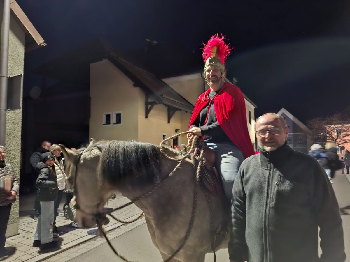 In die Rolle des Heiligen Martin mit Helm und rotem Mantel schlüpfte Tobias Klier, der auf seinem Pferd „Anne“ und seinem Pferdbegleiter Siegfried Rupp den nicht endenden Zug anführte. Die Musiker und „Tobi“ mit der neunjährigen „American-Quarter-Horse-Stute“ brachten die Kinder sicher zum Ziel. Die Freiwillige Feuerwehr sorgte auf den Straßen für die Sicherheit des Umzugs, und der Elternbeirat und das Kindergartenpersonal sorgten für eine perfekte Organisation. Am Kommunbrauhaus verteilten die Feuerwehrmitglieder appetitliche Bratwürste und der Elternbeirat leckere Sankt-Martins-Hörnchen, Glühwein, Kinderpunsch und kalte Getränke. Im Namen des Elternbeirats bedankte sich Vorsitzende Manuela Bösl bei allen Akteuren für die Unterstützung und den Eltern mit ihren Kindern und Großeltern für ihre Anwesenheit.