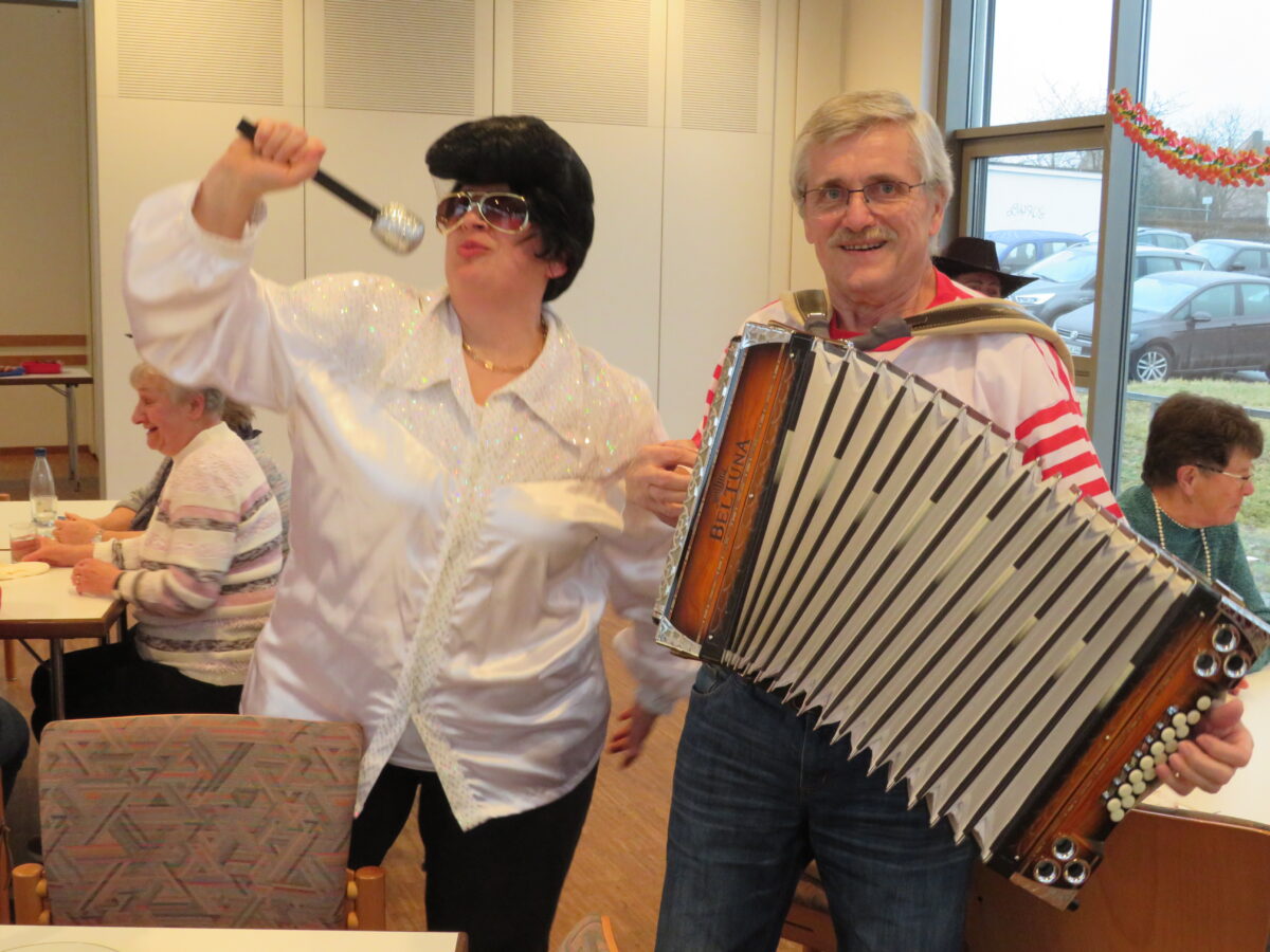 Von Anfang an waren die Tische gut besetzt. Die Seniorinnen und Senioren waren vor allem mit Hüten und Kappen maskiert. Von den Helfern wurden die Gäste mit Kaffee, Krapfen und Kuchen bewirtet. Wer nicht so auf Süßes stand, konnte sich am Buffet deftige Köstlichkeiten holen. Musiker Franz Fichtl unterhielt die Runde mit zünftiger Musik. „Es ist immer wieder eine Freude zu sehen, wie viel Freude die Senioren an der Rund haben“ so Pfarrreferentin Claudia Stöckl, die als „Elvis“ verkleidet war. Pfarrer Thomas Kopp machte der Runde ebenfalls seine Aufwartung.