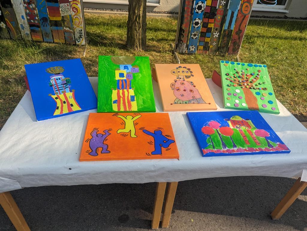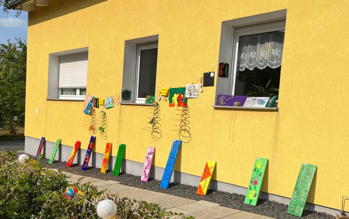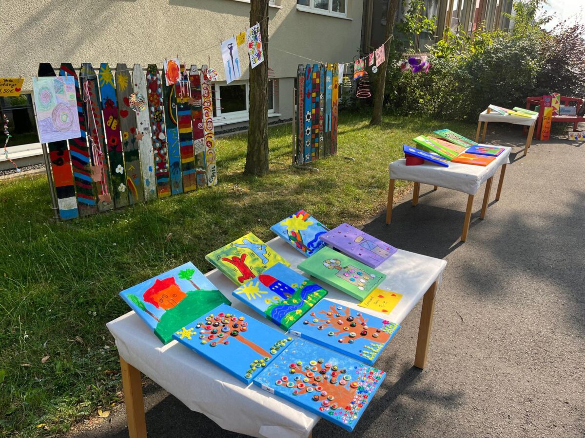 Die Ergebnisse konnten sich wahrlich sehen lassen und sie wurden gesehen und bestaunt bei der Vernissage im Kinderhaus. Eltern, Großeltern, Verwandte und auch Prominenz -darunter Bürgermeister Karlheinz Budnik und Pfarrer Hubert Bartl – waren begeistert von der Kreativität und Schaffenskraft der Kinder. Die Werke konnten gegen einen geringen Obolus gekauft werden, der von den Kids selbst gestaltete Maibaum wurde versteigert.