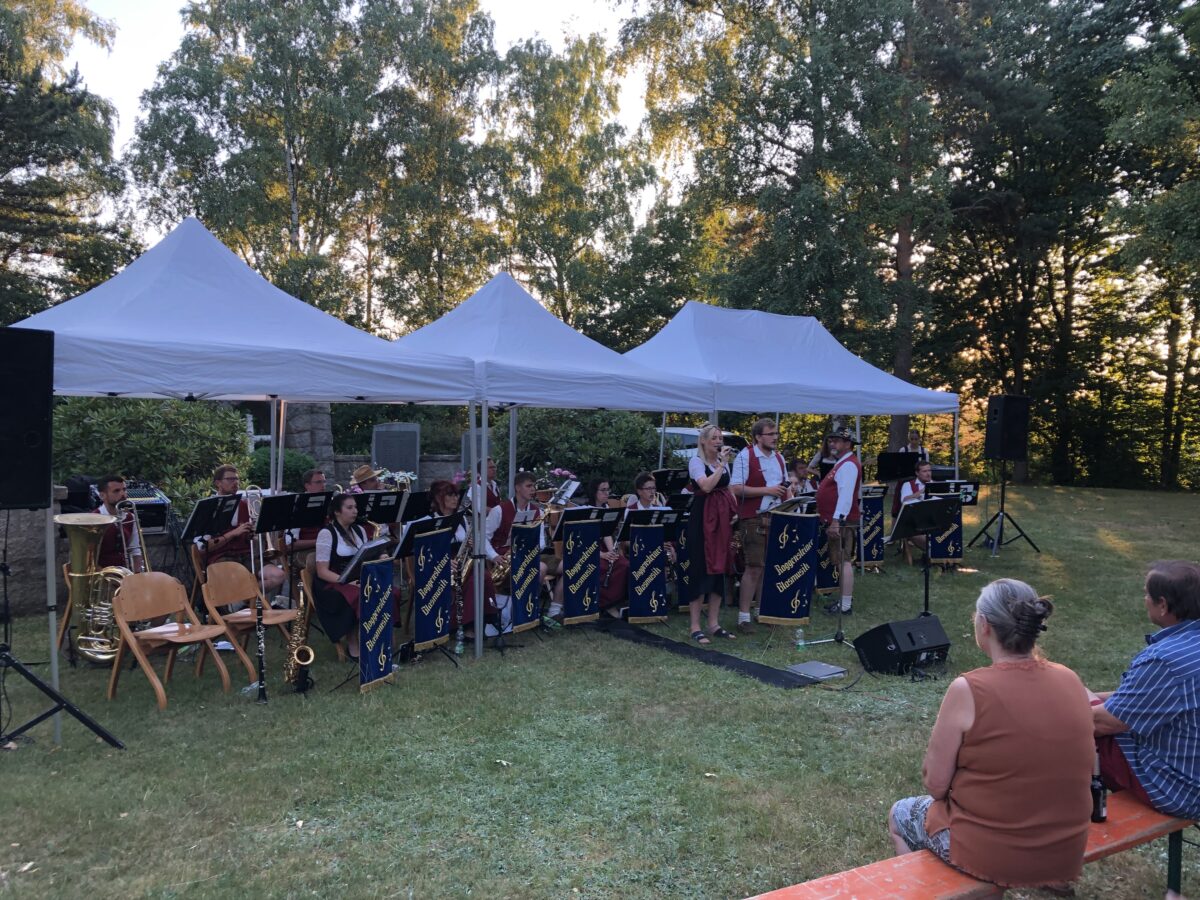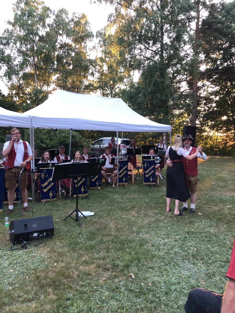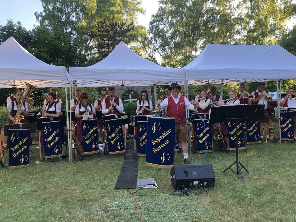 Die Jugendkapelle Roggenstein, unter der Leitung von Sepp Wolfrath, erfreute das Publikum zu Beginn mit klassischer Blasmusik. Auf dem Programm standen Werke wie „Wir sind Kinder von der Eger“ und der Erzherzog-Albrecht-Marsch. Durch den Abend führten Vincent und Michael Fenzl, während Katharina Klaszka, Sepp Wolfrath, Gerhard Maier und Bastian Fenzl als Sänger überzeugten. Besondere solistische Leistungen zeigten Bastian Fenzl, Michael Fenzl und Florian Reil auf ihren Instrumenten. Katharina Klaszka, die Tochter des Kapellmeisters, stand kurz davor, ihren Vater zum Großvater zu machen und tanzte ausgelassen auf der Wiese.
