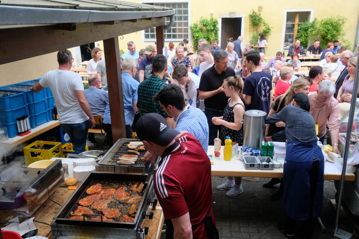 Auf „Bestellung“ des Pfarrers, mit einem idealen Festwetter gesegnet, standen die Besucher schon zur Mittagszeit Schlange, um das herzhafte Angebot an Grillspezialitäten zu genießen. Stets umlagert auch der Torten- und Kuchenstand. Verführerisch das Sortiment in der Kühltheke laufend ergänzt vom Helferteam des Seniorenclubs nach Anlieferung der Leckereien durch die spendierfreudigen Eschenbacher Hobby-Konditorinnen.