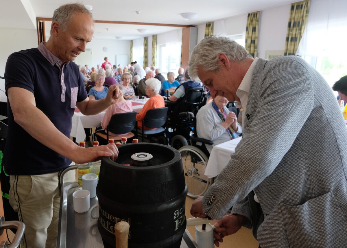 Der Beginn des Fests wurde mit Kaffee und Erdbeerkuchen eingeläutet, was bei den Anwesenden sehr gut ankam. Ein besonderer Moment war, als Bürgermeister Robert Lindner mit zwei geschickten Schlägen das Bierfass anstach und dabei ein lautes „Ein Prosit der Gemütlichkeit“ in die Runde rief, was die festliche Atmosphäre noch unterstrich.