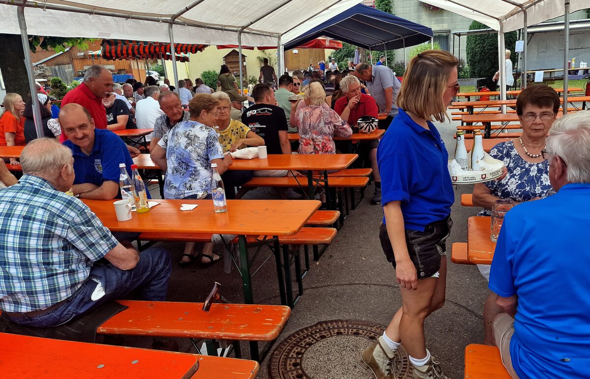 Die Damen im Verein wünschten sich erstmals eine Weinlaube zum Dorffest. Dort servierten sie Weiß- und Rosewein. Aber auch Kaffeeduft zog durchs Feuerwehrhaus, die Hausfrauenkuchen waren vielfältig für eine gelungene Kaffeetafel. Auch musikalische Unterhaltung begleitete das Fest über viele Stunden. Am Abend öffnete die Bar an der Weinlaube.
