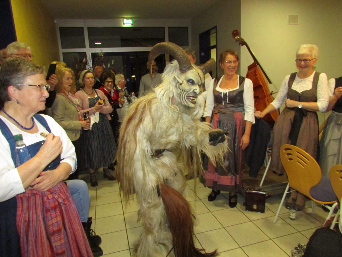 Eine Überraschung gab es zu Beginn der Pause, als schaurige Geräusche ertönten und zwei Mitglieder der Flossboch Deifln`n in wilden Kostümen erschienen. Sie dienten eher als beliebte Fotomotive denn als Schreckgespenster. Mit dem Mitmachlied “Auf und Ab” von der Hackbrettgruppe mit Akkordeonbegleitung wurde das Publikum aktiviert. Auch das Mitsinglied “Hei so eine Schneeballschlacht” sorgte für interaktiven Spaß.