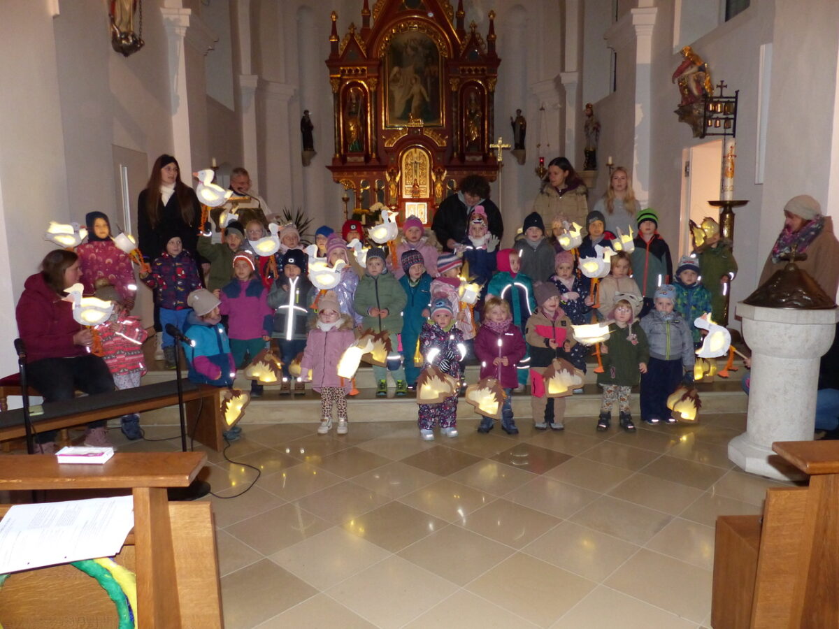 Vor dem Volksaltar standen die Mädchen und Buben mit selbstgebastelten Laternen, jede Laterne stellte eine Gans dar. Das Eröffnungslied Lichterkinder sangen die Kinder mit sichtbarer Freude. Ihre Leiterin Anita Wittmann begleitete sie mit ihrem Team, das mit den Zöglingen den Abend einstudiert hatte.