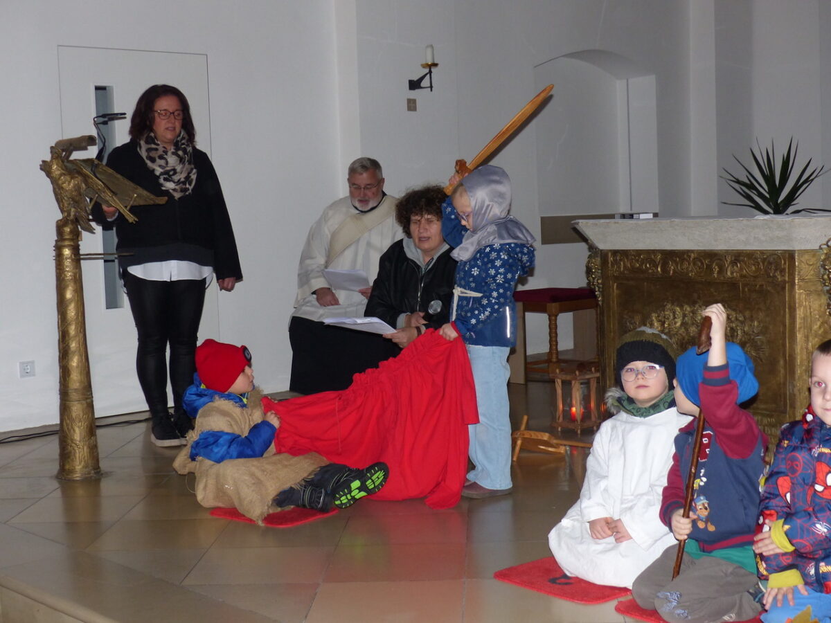 In der Andacht stellte Ulrich Wabra heraus, was Laternenbasteln lehrt: hinschauen und teilen, so wie es St. Martin vormachte. Die Vorschulkinder führten vor dem Volksaltar die Geschichte vom Heiligen Martin auf und zeigten die Szene, in der St. Martin seinen Mantel mit einem Bettler teilte.