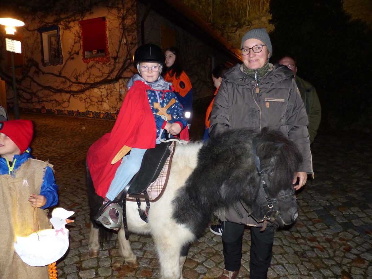 Am Ende der Feier segnete der Diakon die Martinshörnchen. Bevor die Kleinen mit ihren Laternen aus der Kirche auszogen, spendete er allen den Schlusssegen. Den großen Zug führte das Pferd Apatsch an; darauf saß der Heilige Martin, dargestellt von Lina, und Pferdebesitzerin Sabine Gruber führte das Tier. Gemeinsam mit ihren Familien und Ulrich Wabra wanderten alle, erleuchtet von den Laternen, um die Burg zum Pfarrheim.