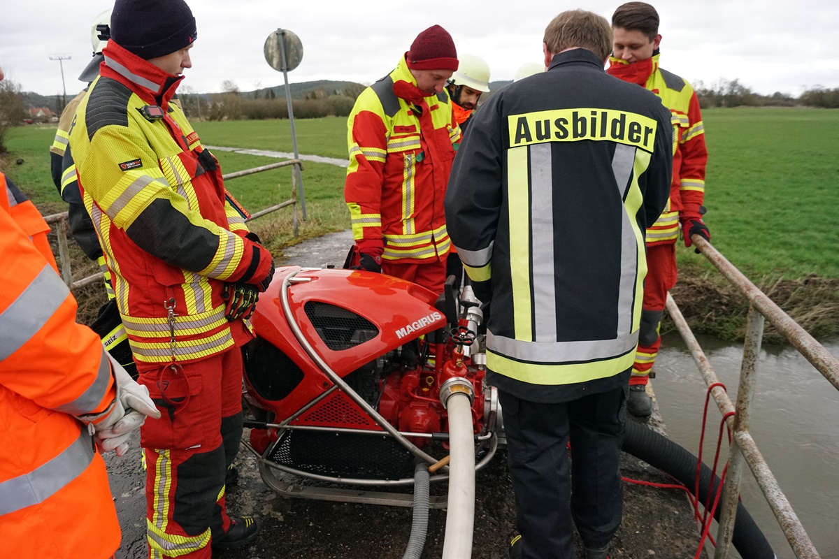 Auch der sichere Umgang mit dem Feuerwehrfahrzeug ist ein Thema. Deshalb gehören neben einer Grundeinweisung in das Fahrzeug auch die regelmäßigen Bewegungsfahrten zum Ausbildungsumfang. Am letzten Tag bekamen die Teilnehmer eine praktische Einweisung der Wasserförderung im Gelände sowie das Erkennen und Beheben von Störungen an der Feuerlöschkreiselpumpe aufgezeigt.