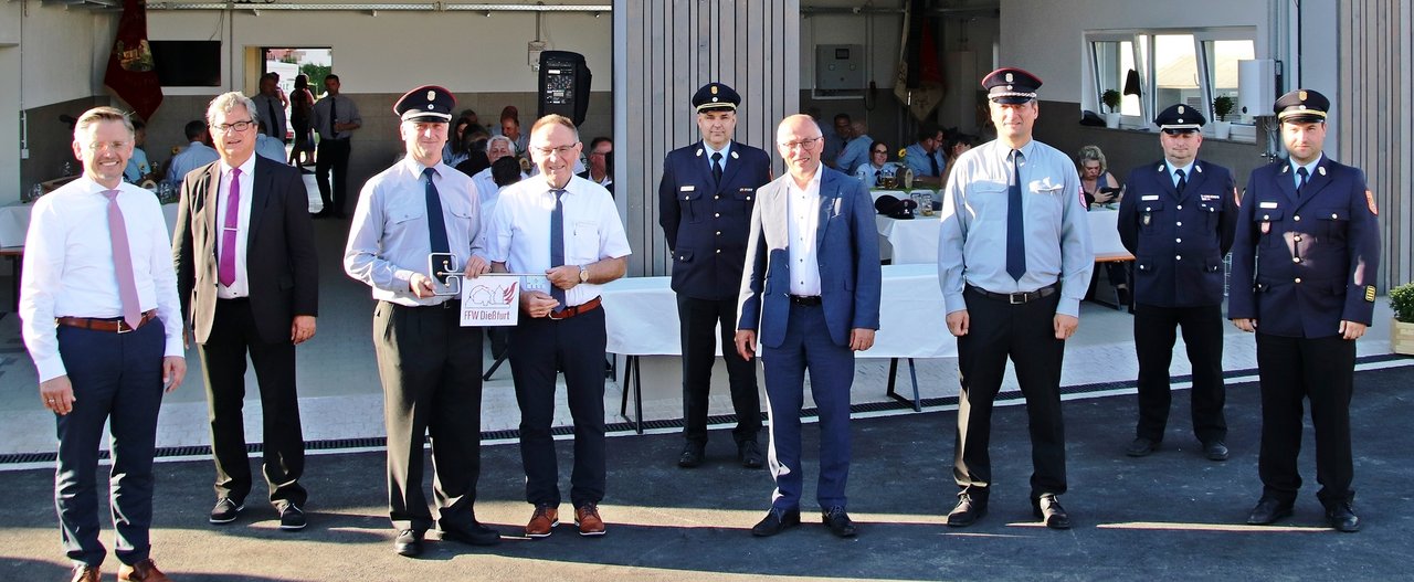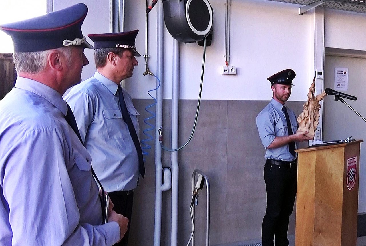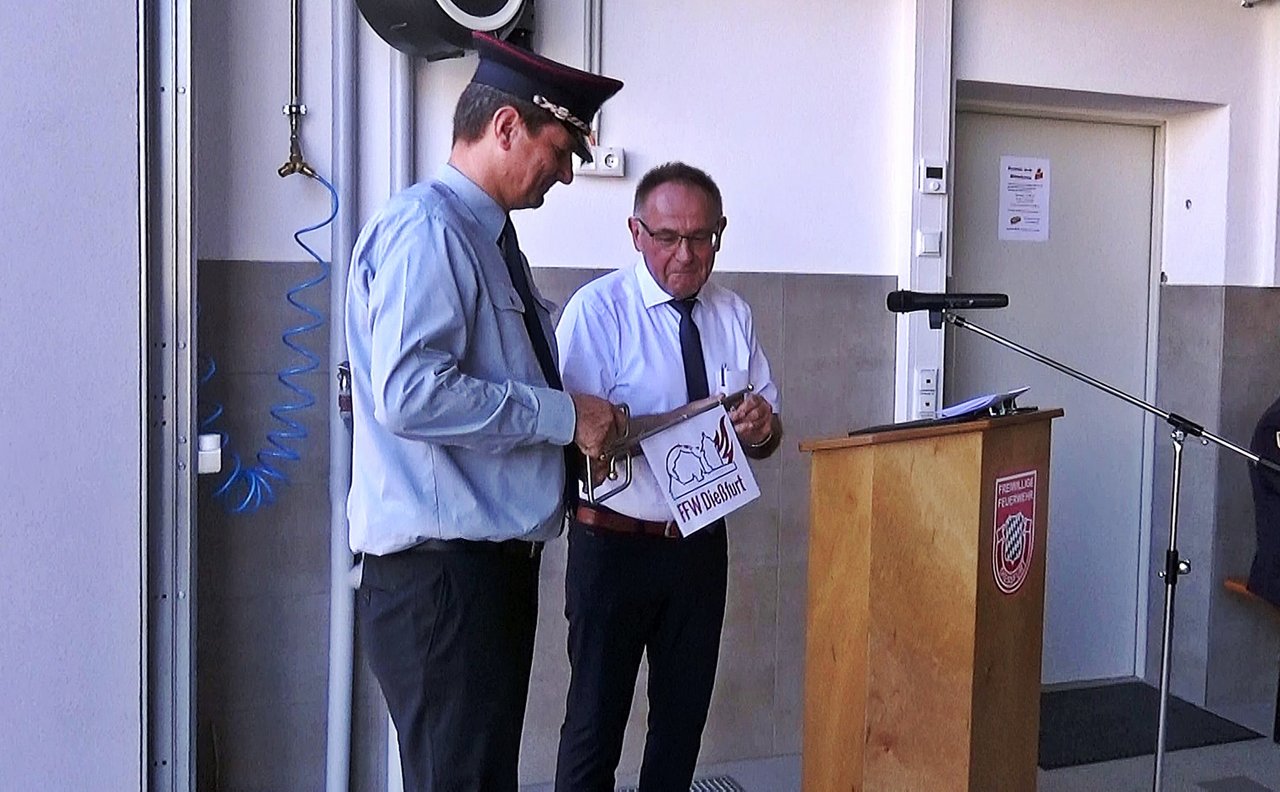Albert Nickl und Tobias Reis beglückwünschten die Wehr ebenso: „Kameradschaft ist wichtig und dies hier ist ein Gemeinschaftsprojekt!“. Kreisbrandrat Marco Saller bekräftige: „Wir wissen was wir an Dießfurt haben“. Florian Eckert hatte noch ein symbolträchtiges Geschenk für das neue Feuerwehrhaus dabei. Er übergab der Vorstandschaft einen holzgeschnitzten Florian für das „Florians Stüberl“.