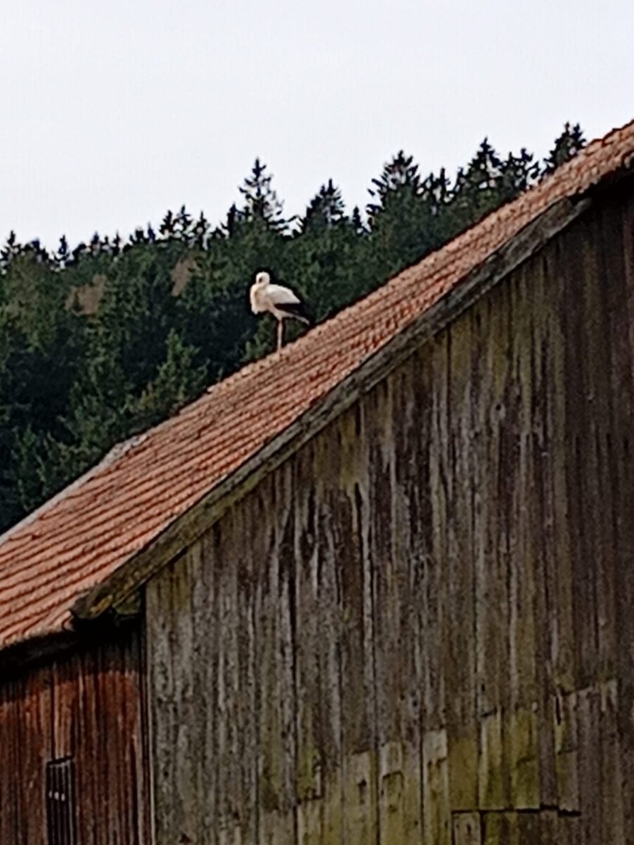 Erstmals besuchte ein Storch das Fahrenbergdorf Oberbernrieth und verweilte fast den ganzen Vormittag hier. Zuerst stolzierte er, auf der Suche nach Futter, in den Wiesen oberhalb des Dorfes herum und ruhte sich dann auf dem Dach des alten “Schererhauses” aus. Bleibt nur zu hoffen, dass dieser einmalige Besuch Meister Adebars auch Auswirkungen auf eine höhere Bevölkerungszahl hat.