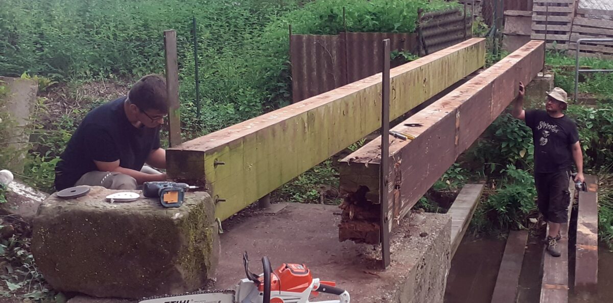 Jedoch nagte der Zahn der Zeit am Bauwerk. Trotz regelmäßiger Pflege und Reparaturen, unter anderem durch den Schützenverein Eichenlaub, zeigte sich, dass eine grundlegende Sanierung notwendig war. Christian Geigenmüller und Sebastian Bayer, die die Planung übernahmen, entschieden, dass es Zeit für “Nägel mit Köpfen” war. Mit einer Gruppe freiwilliger Helfer starteten sie Anfang des Jahres die Erneuerungsarbeiten.